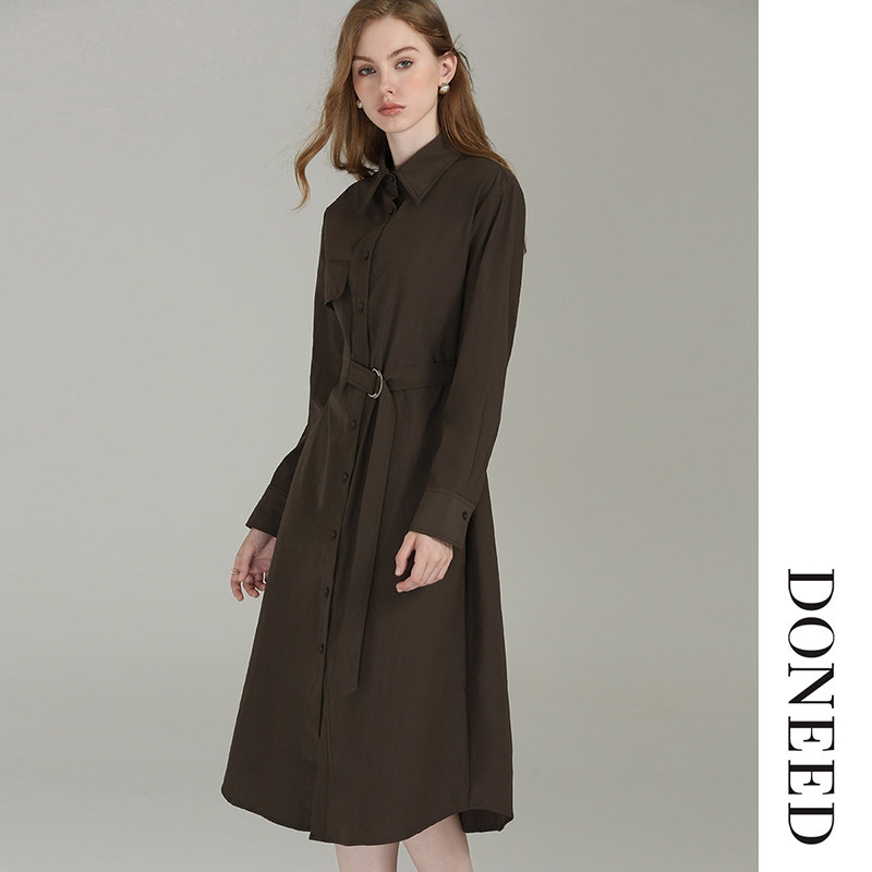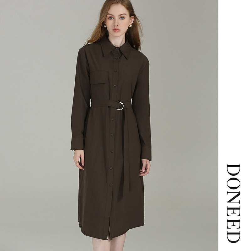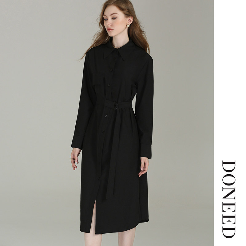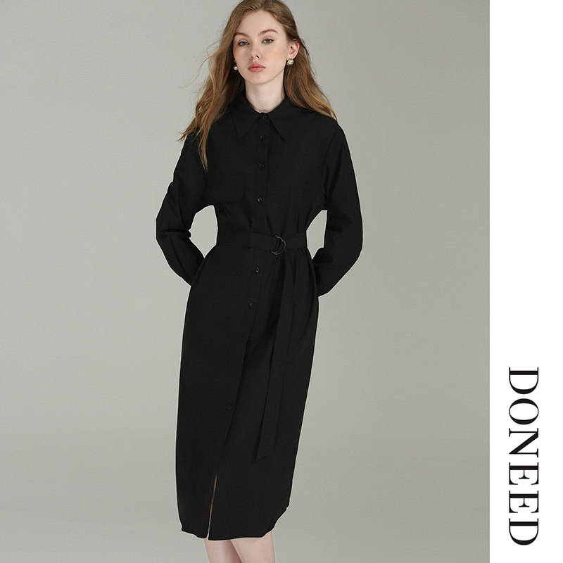 DONEED春款时尚简约纯色翻领衬衣裙设计感系带收腰显瘦连衣裙女