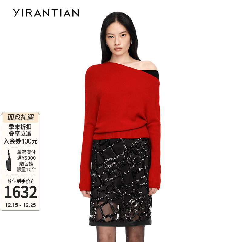 【YIRANTIAN】明星同款女士柔软细腻斜肩拼接露肩针织上衣红毛衣