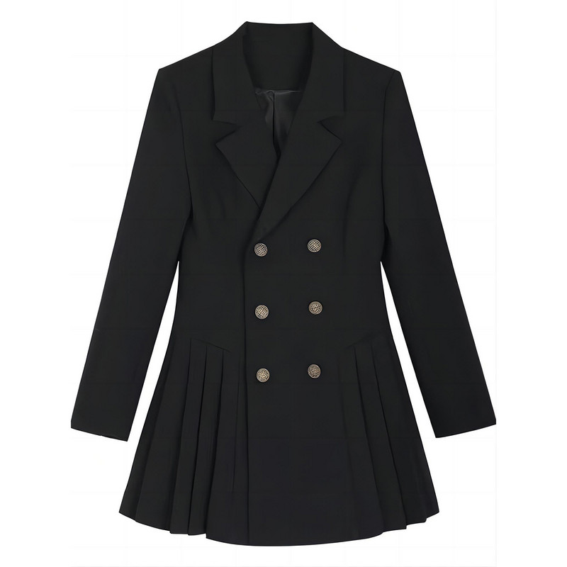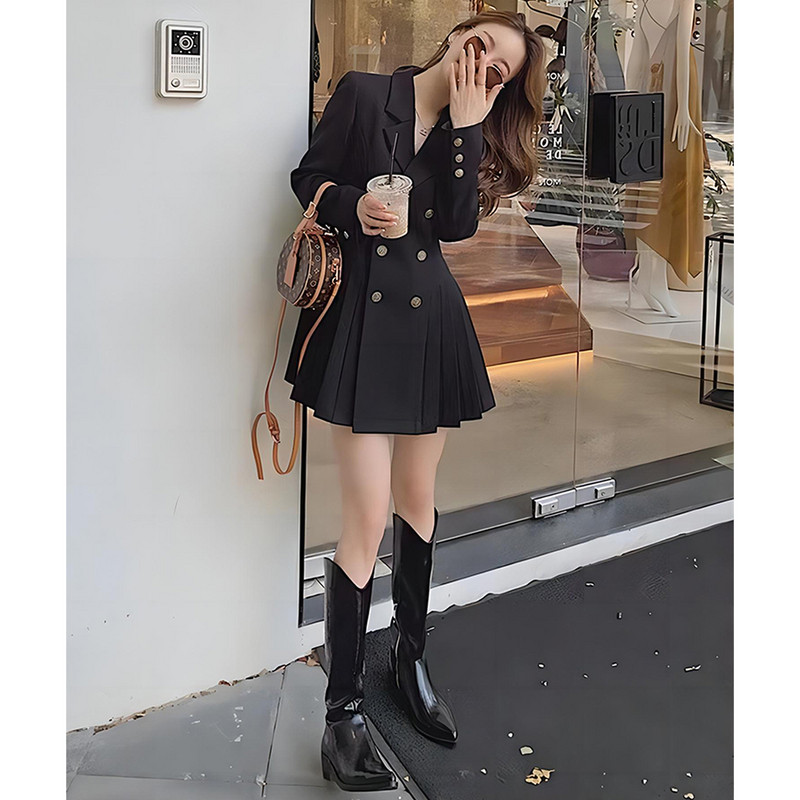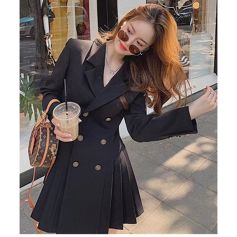 时尚长袖百褶连衣裙 百搭黑色裙子