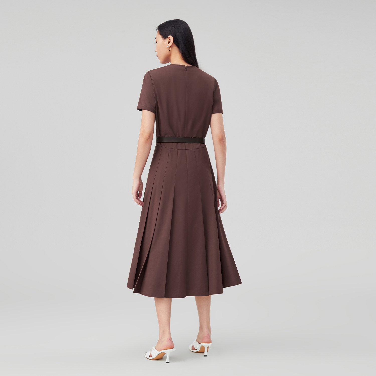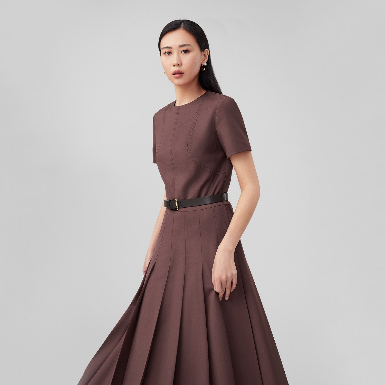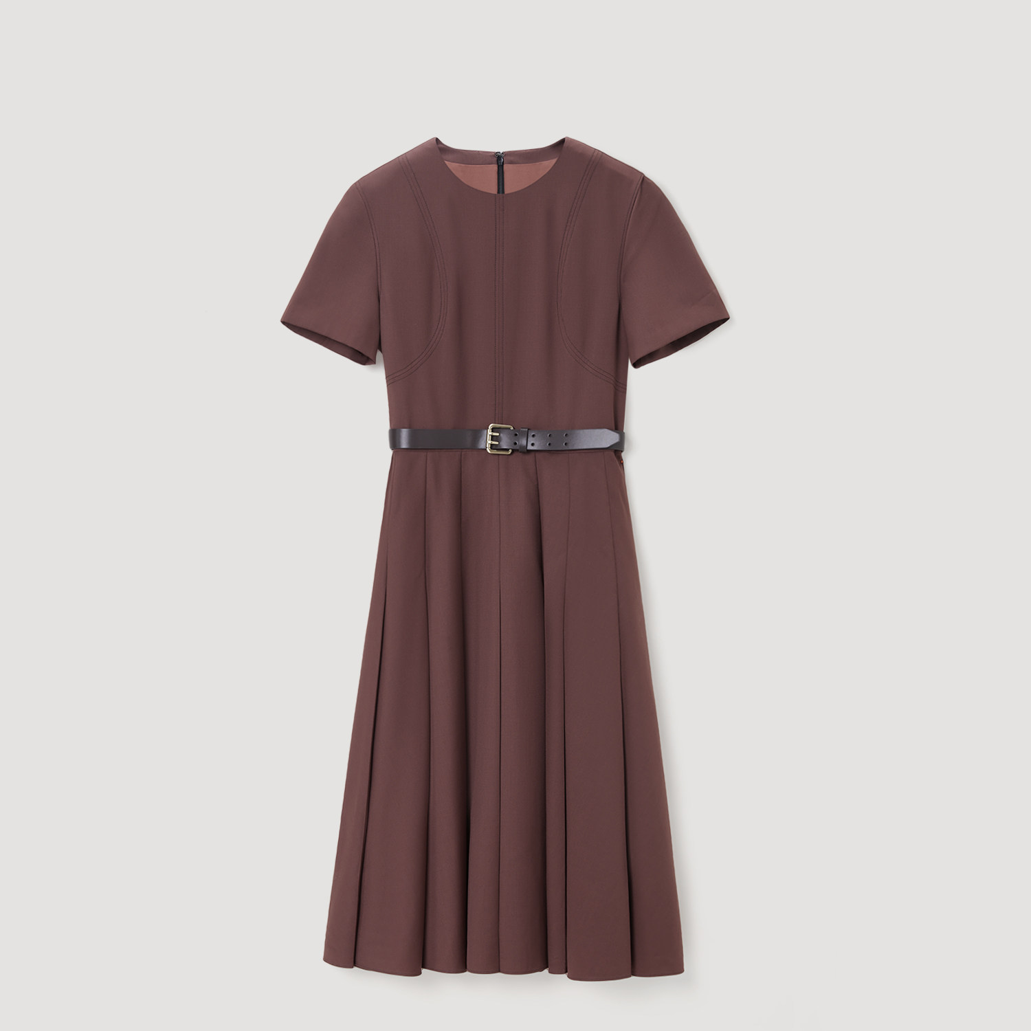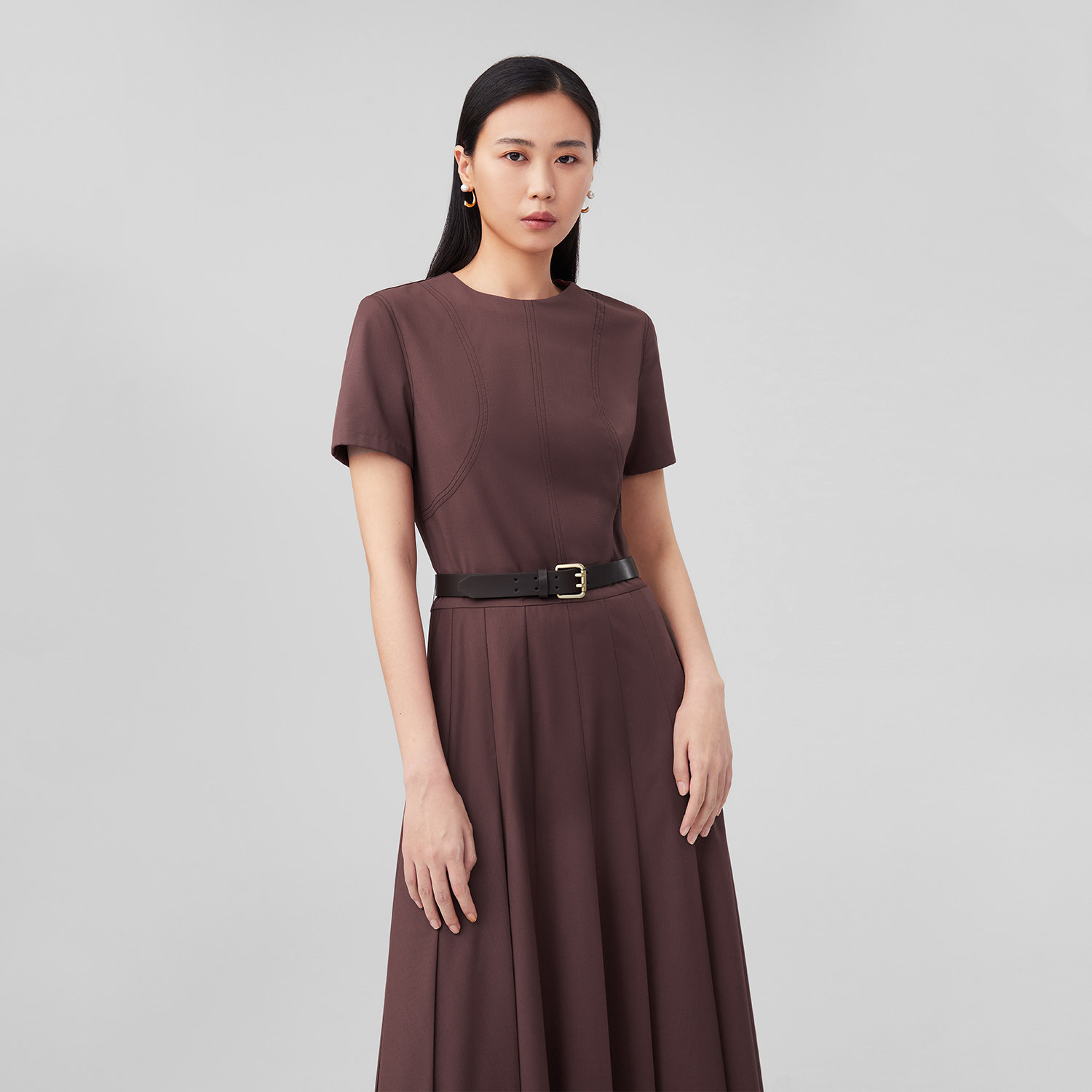 OVV秋冬新款女装优雅百褶下摆随附撞色腰带短袖连衣裙