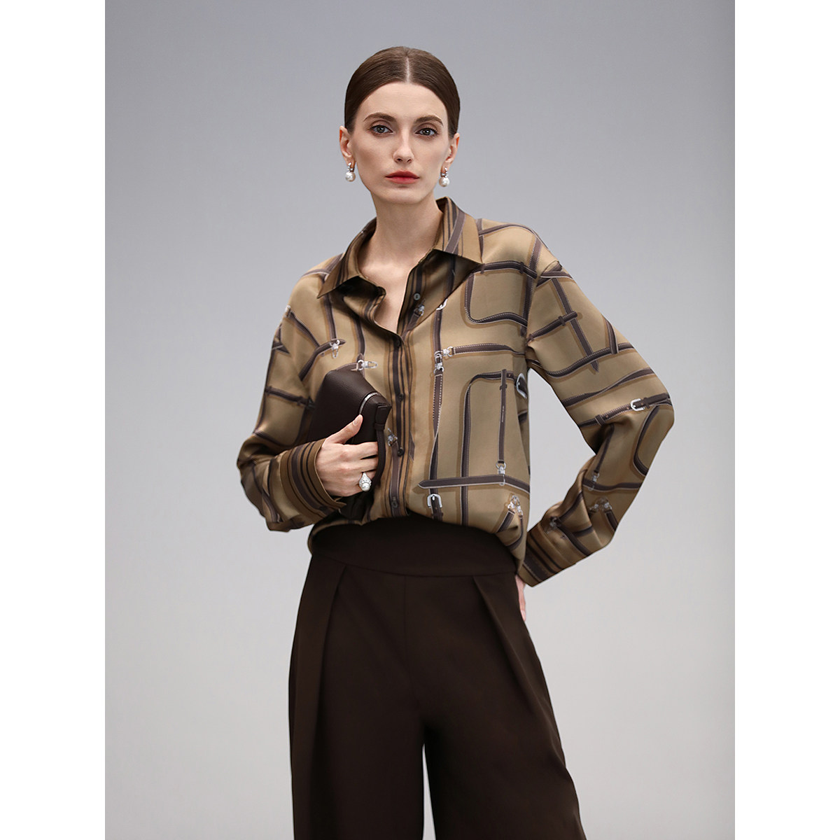 COCOBELLA3D定位印花翻领衬衫早秋知性通勤重磅缎面上衣SR3098