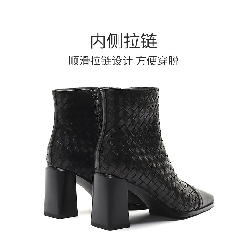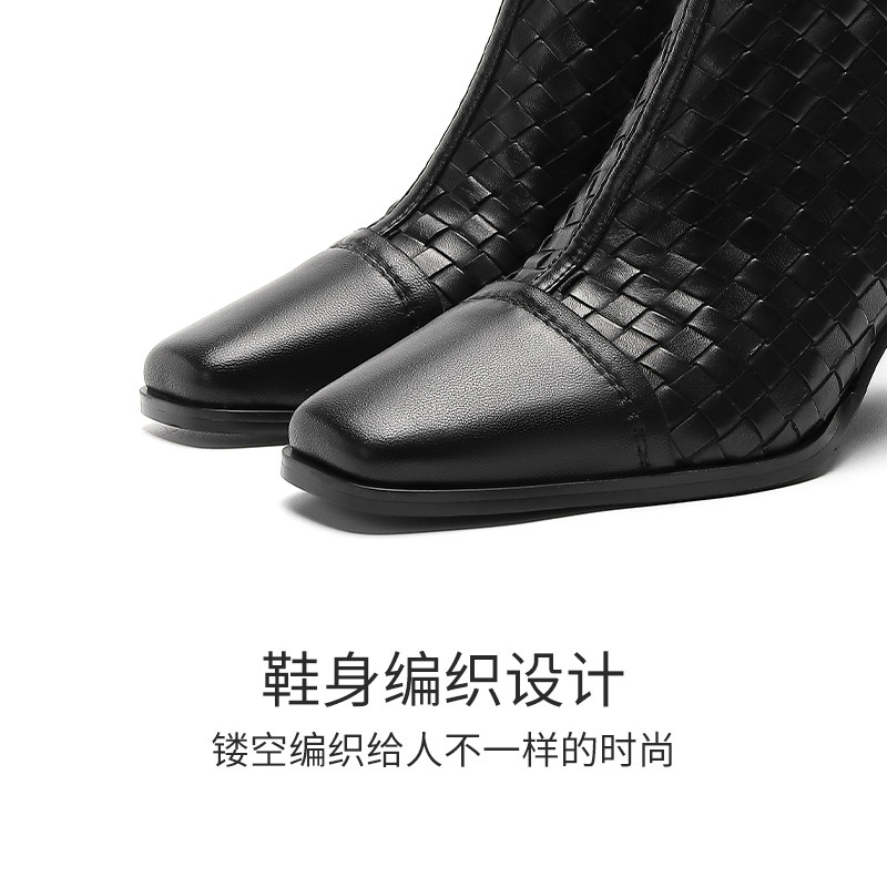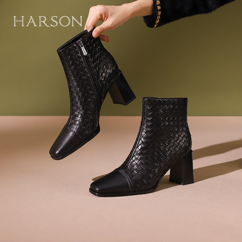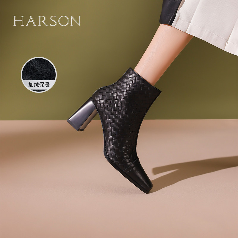 哈森秋冬新款粗高跟皮靴女士编织复古设计感时装短靴HWA230185