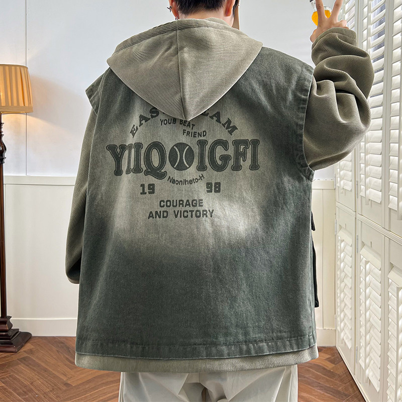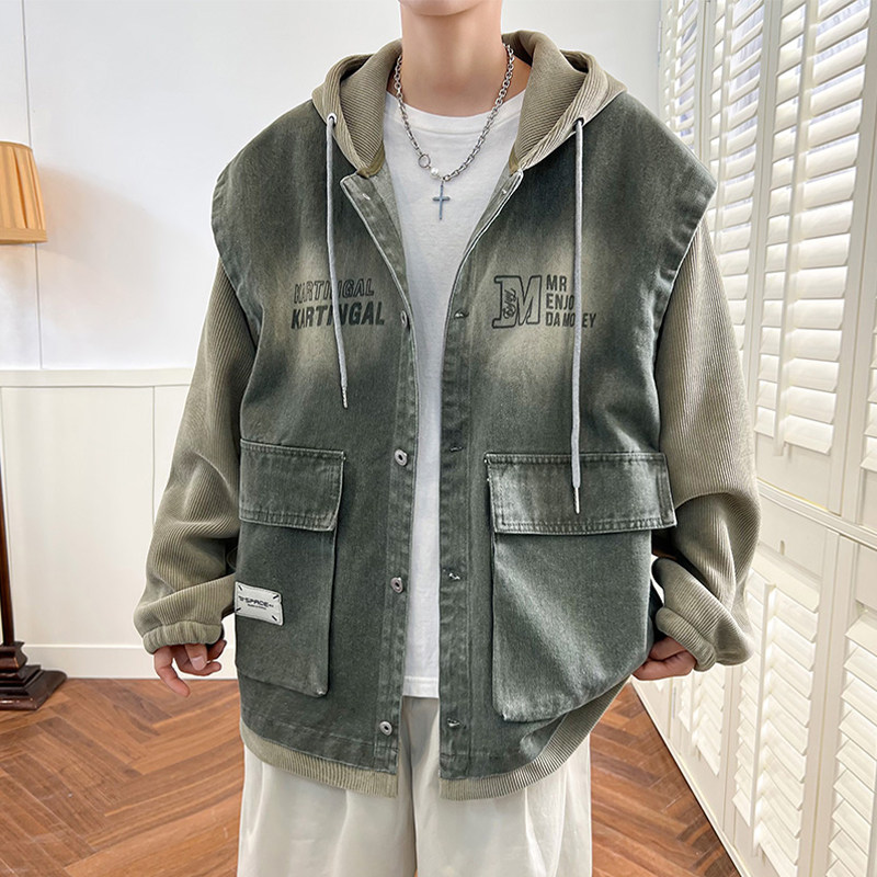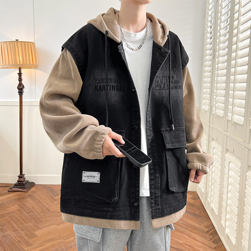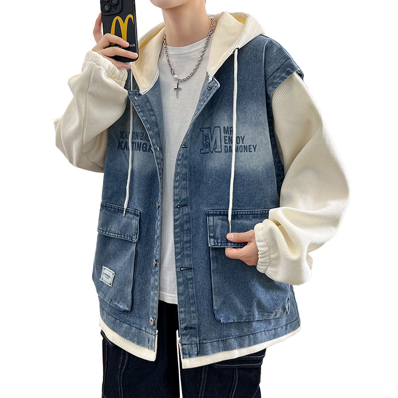 假两件外套男春秋款撞色拼接牛仔夹克男装潮牌青少年港风连帽褂子