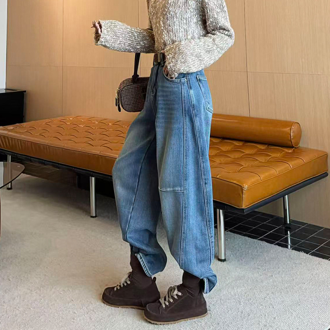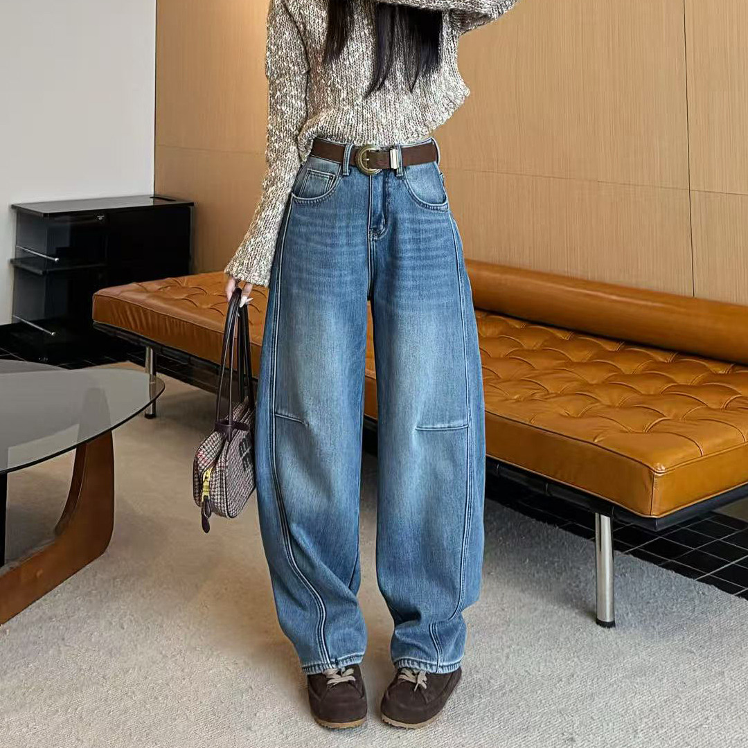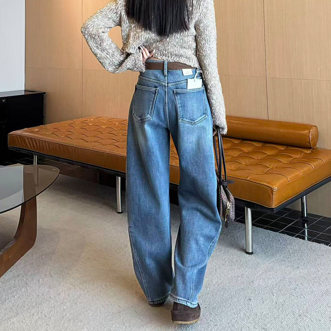 2025秋冬新款蓝色加绒阔腿牛仔裤女宽松高腰长裤直筒弯刀裤拖地裤