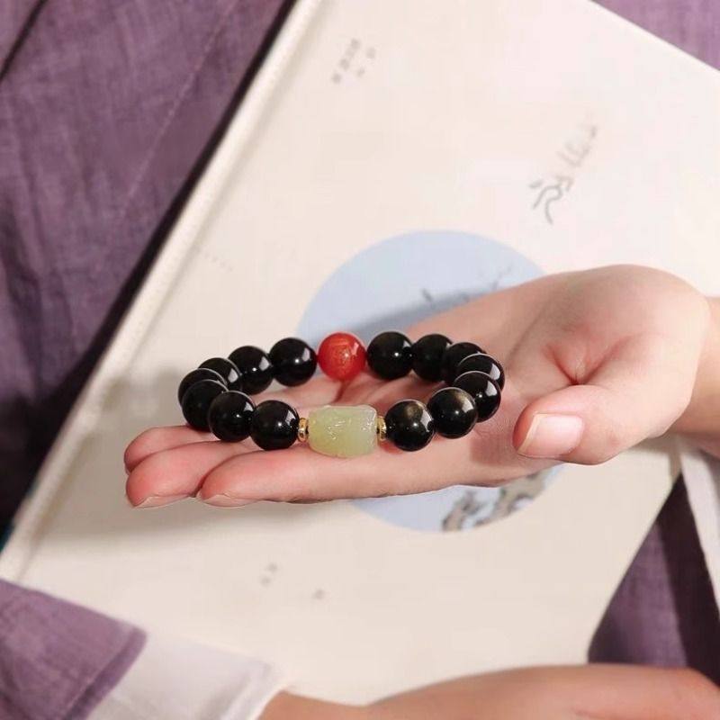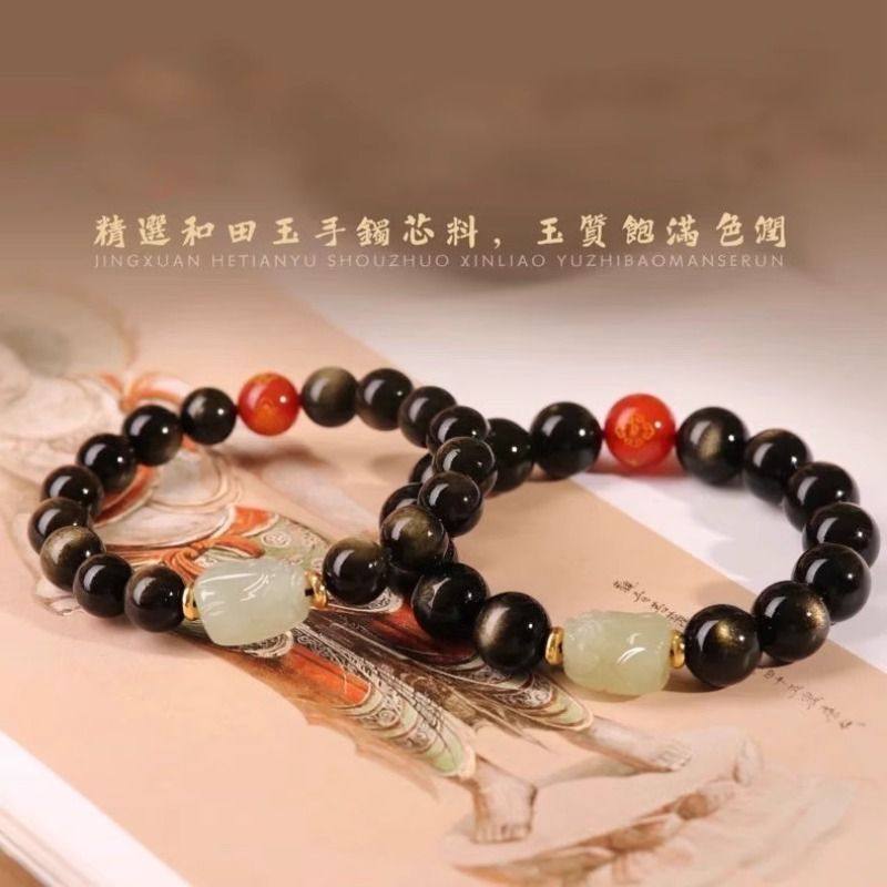 VZZS和田玉貔貅手串女男款转运珠黑曜石金曜石佛珠手链