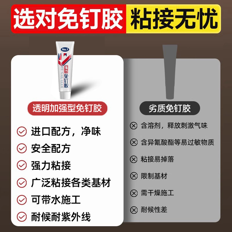 强力高粘免钉胶高粘度粘墙面金属墙壁镜子瓷砖踢脚线卫生间置物架贴墙专用防水家用胶多功能粘得牢胶水修补