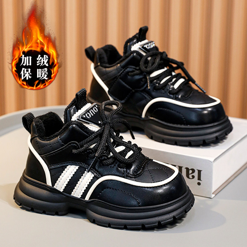巴布豆女童鞋子冬季2025新款儿童加绒二棉运动鞋女孩老爹鞋潮黑色
