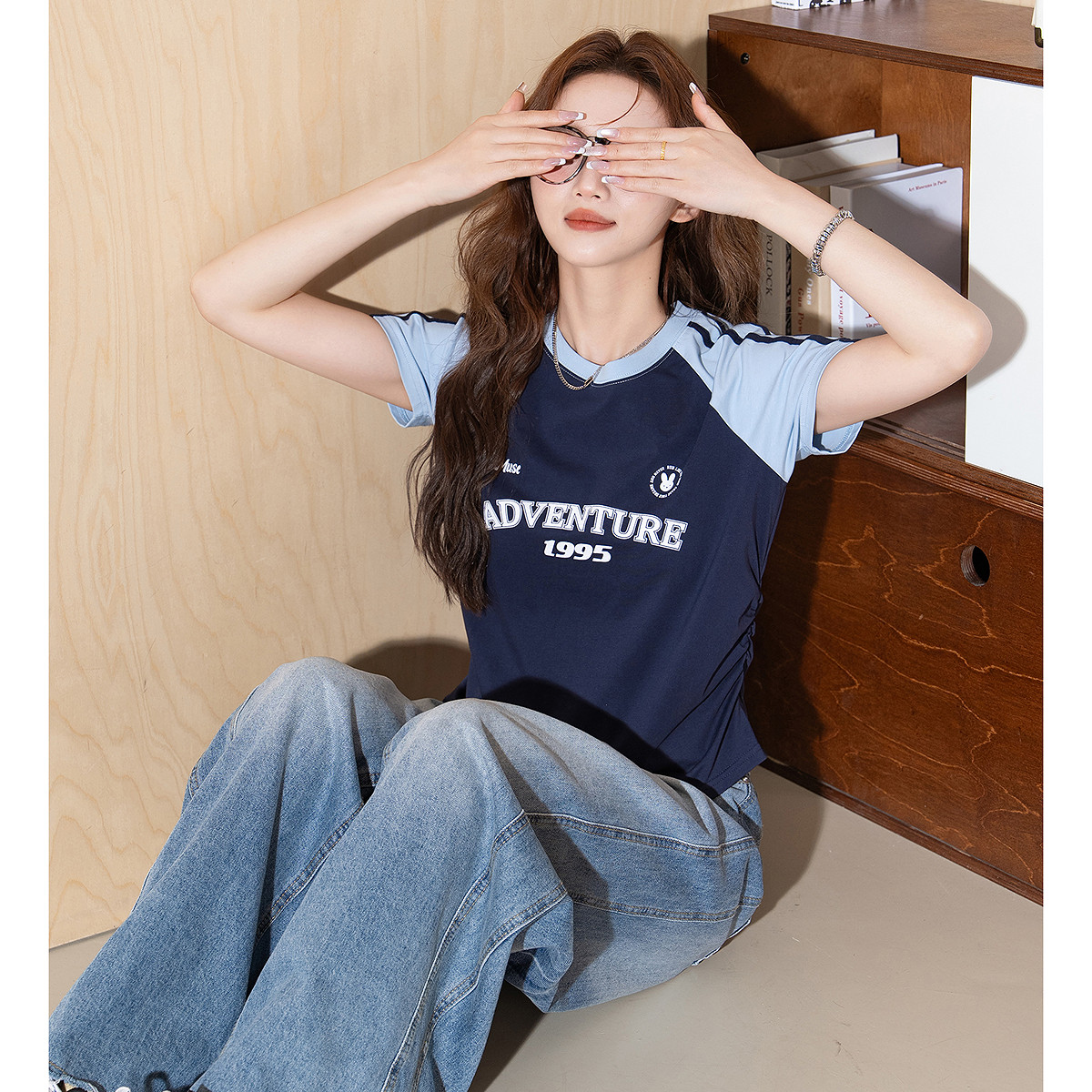 唐狮夏女新款短袖T恤学生运动风休闲今年流行插肩袖撞色上衣官方