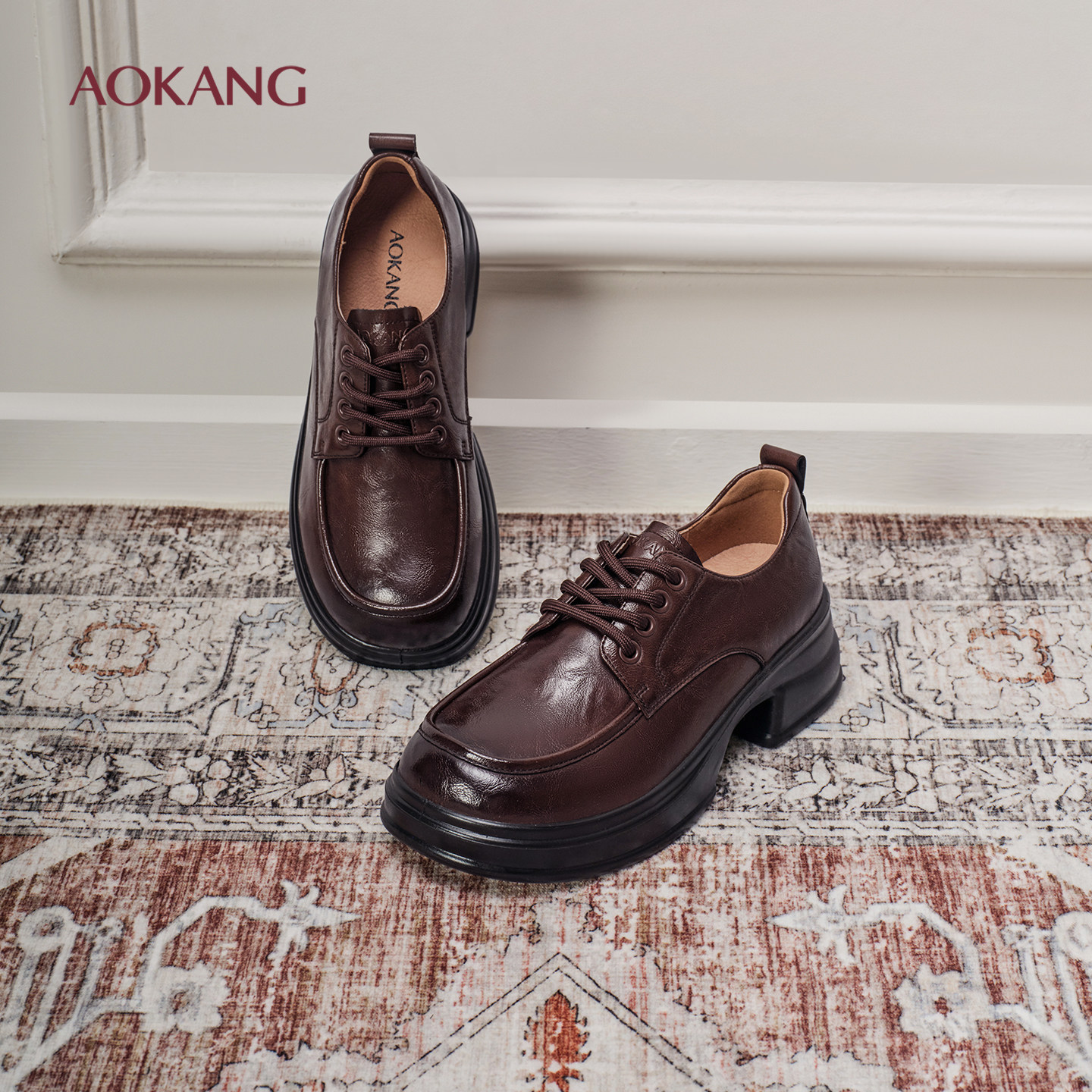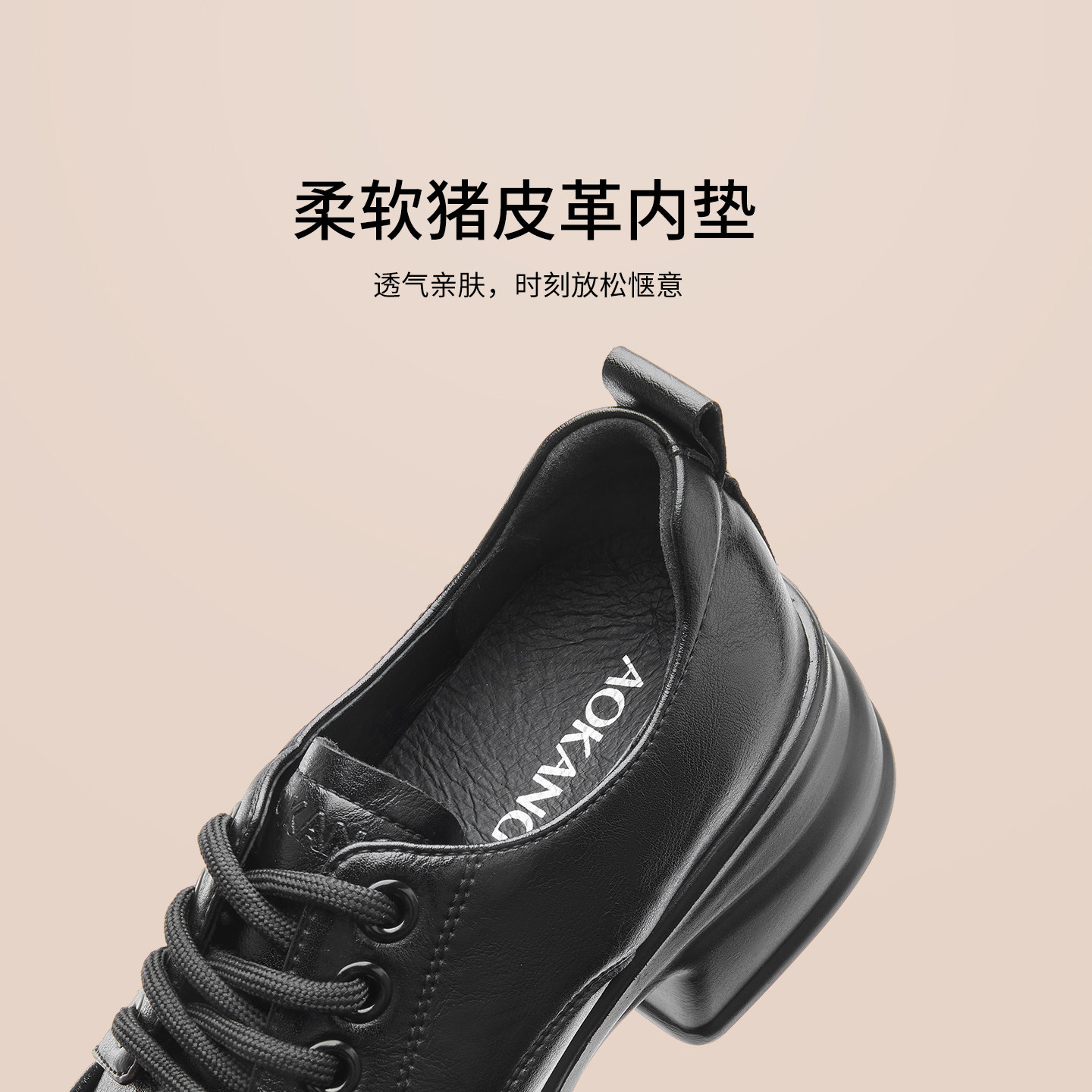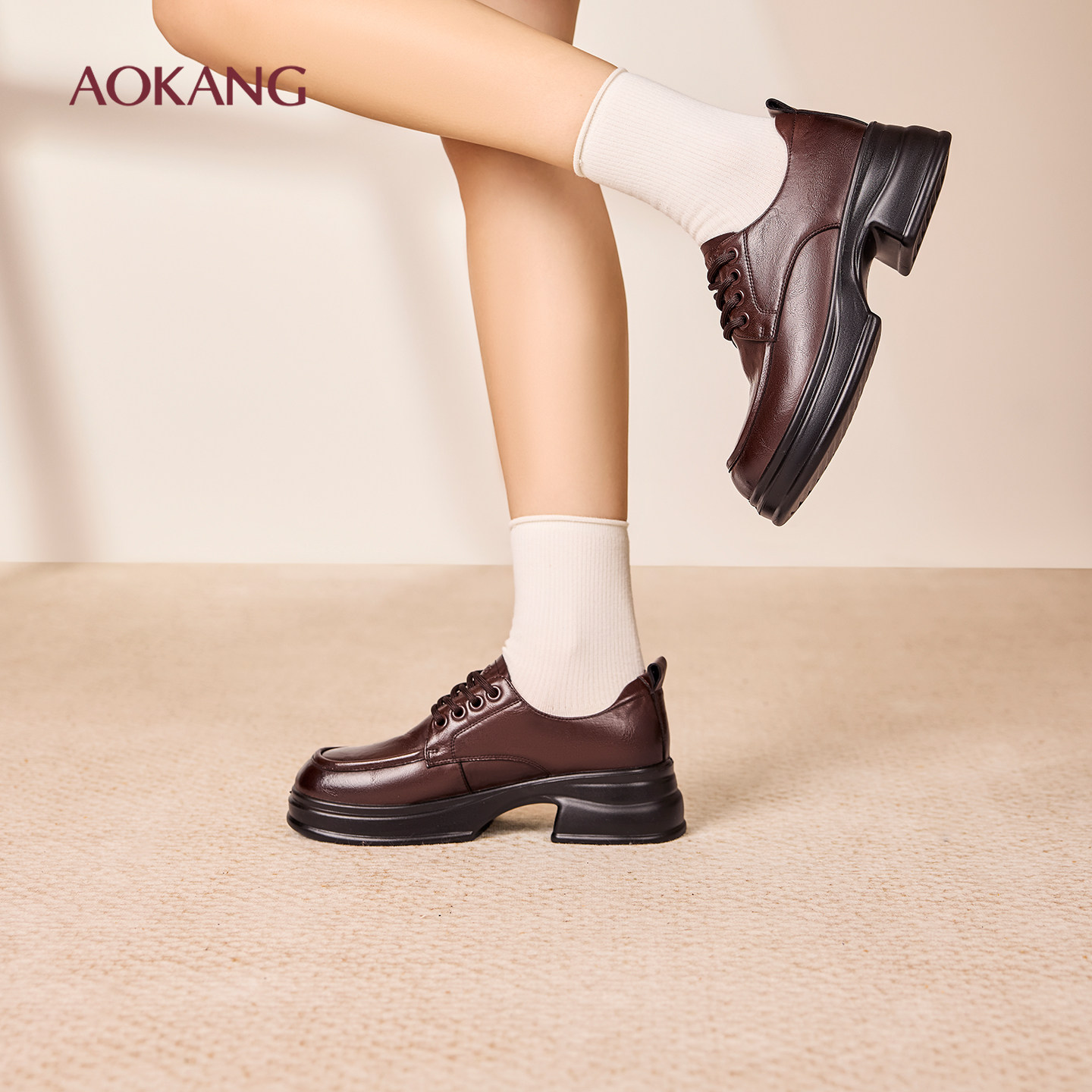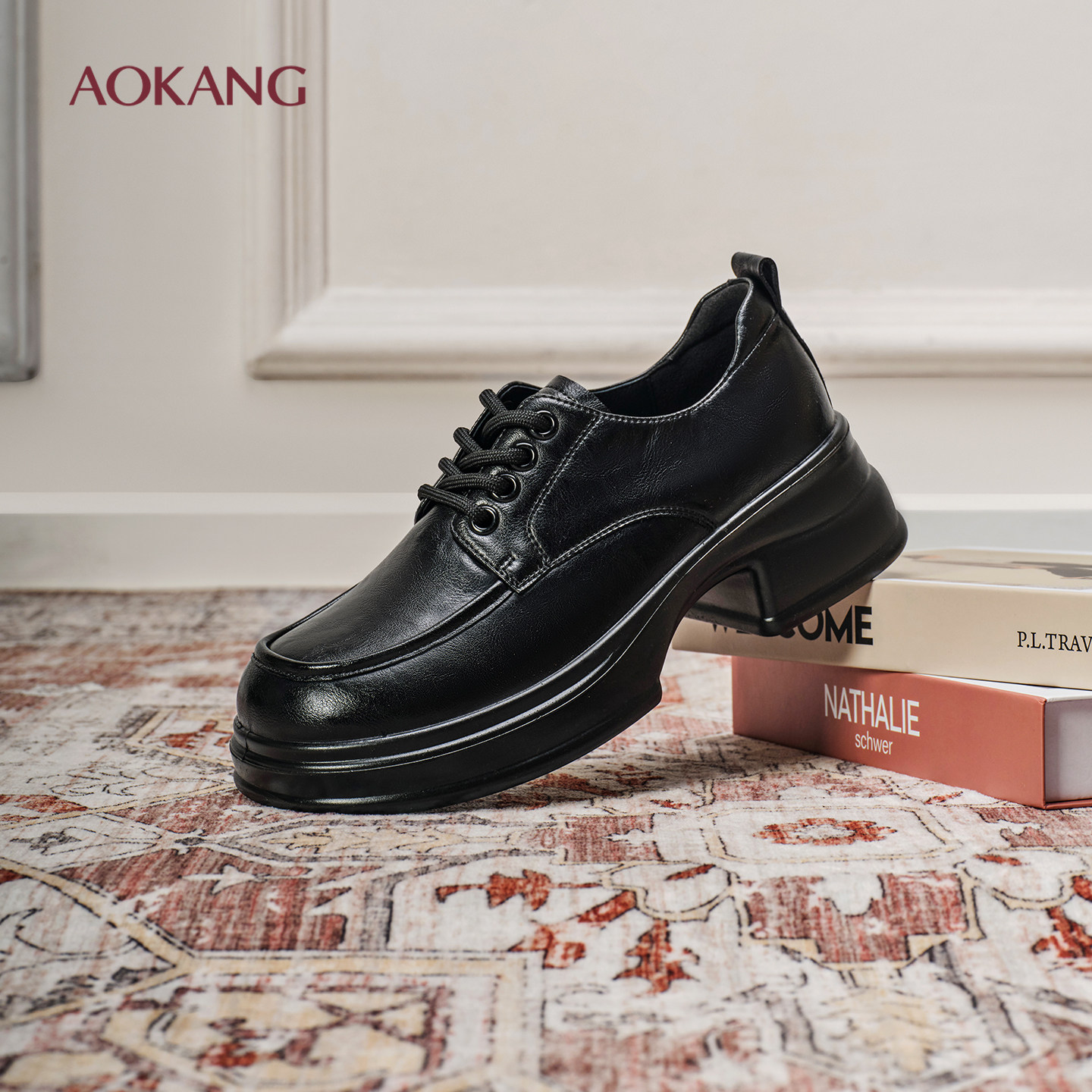 奥康 女鞋2025秋季新款复古乐福鞋黑色女圆头系带百搭厚底小皮鞋