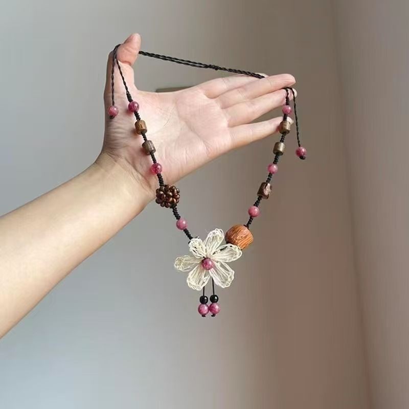 复古胭脂粉串珠编织花朵项链清冷感艺术国风ins麻花链高级感颈链