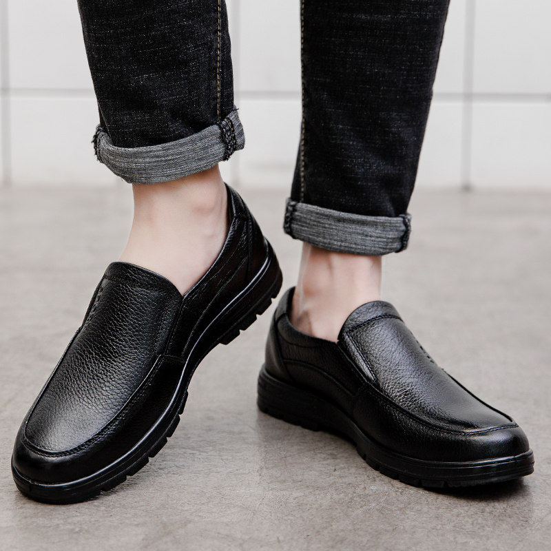 新款休闲皮鞋男真皮韩版潮流商务厚底轻质橡胶发泡底一脚蹬乐福鞋