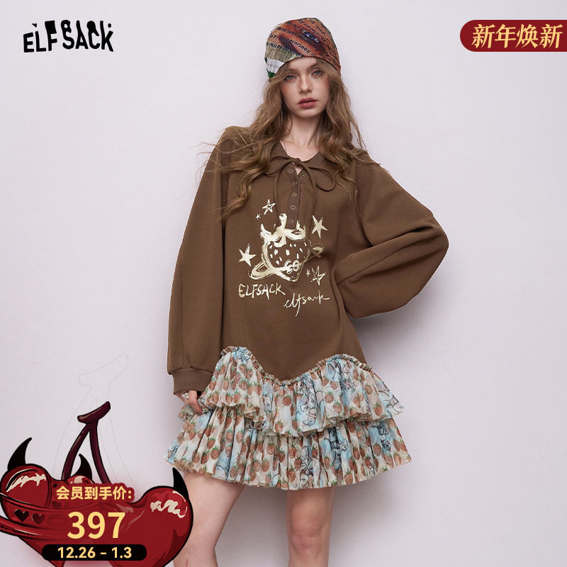 妖精的口袋草莓烫金网纱拼接连衣裙女2025年早秋新款设计感卫衣裙