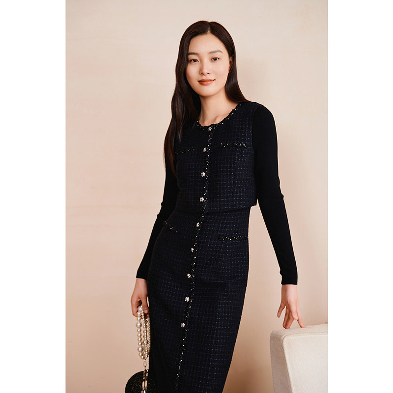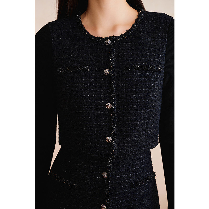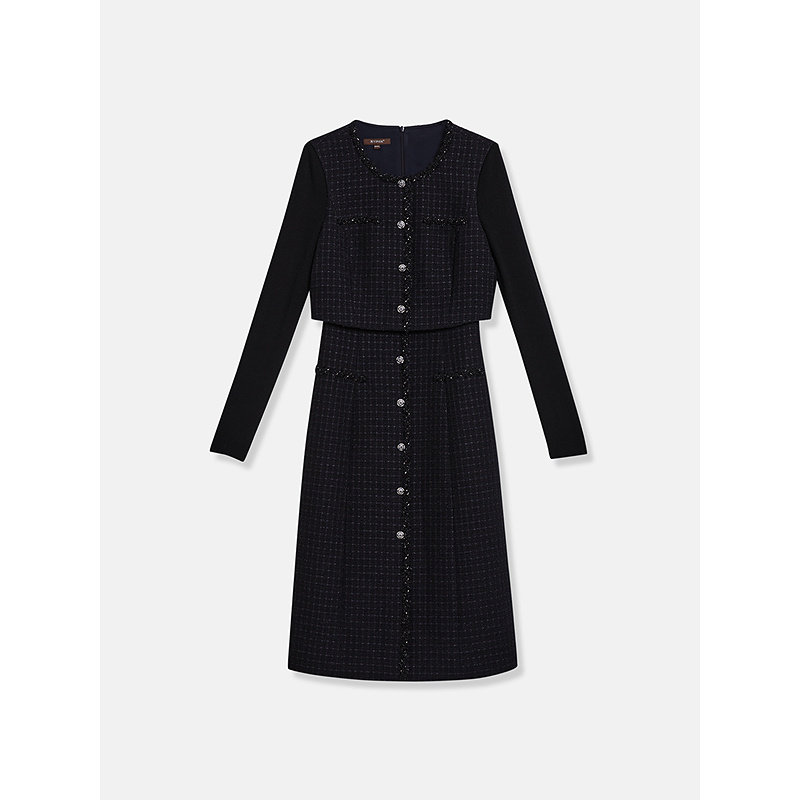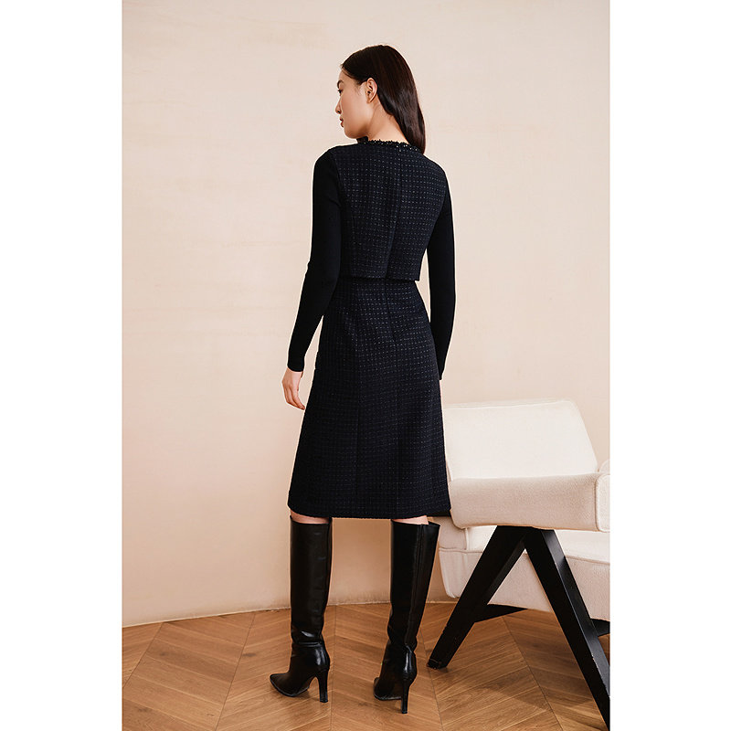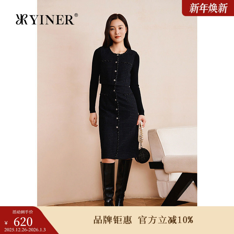 YINER音儿专选2025春季新款法式优雅粗花呢假两件收腰连衣裙