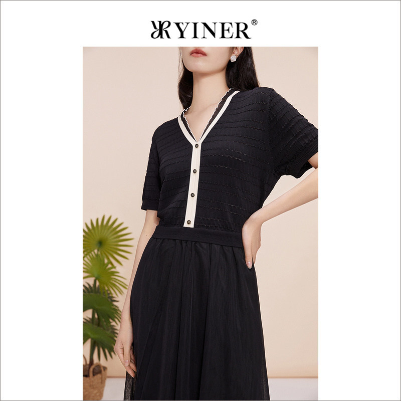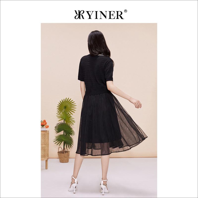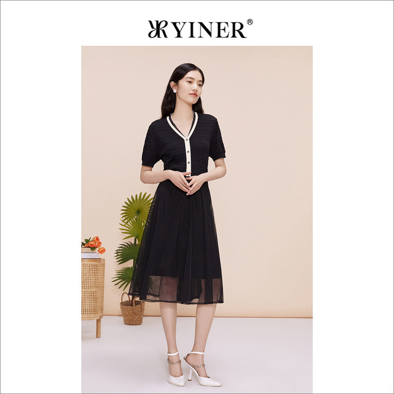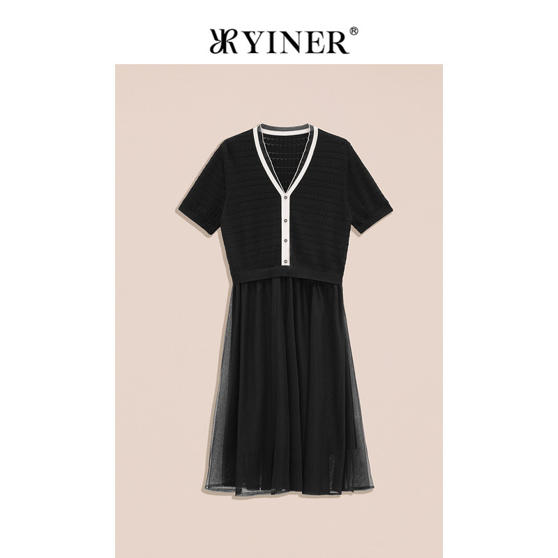 YINER音儿专选女装夏季法式优雅V领小黑裙木耳边网纱连衣裙