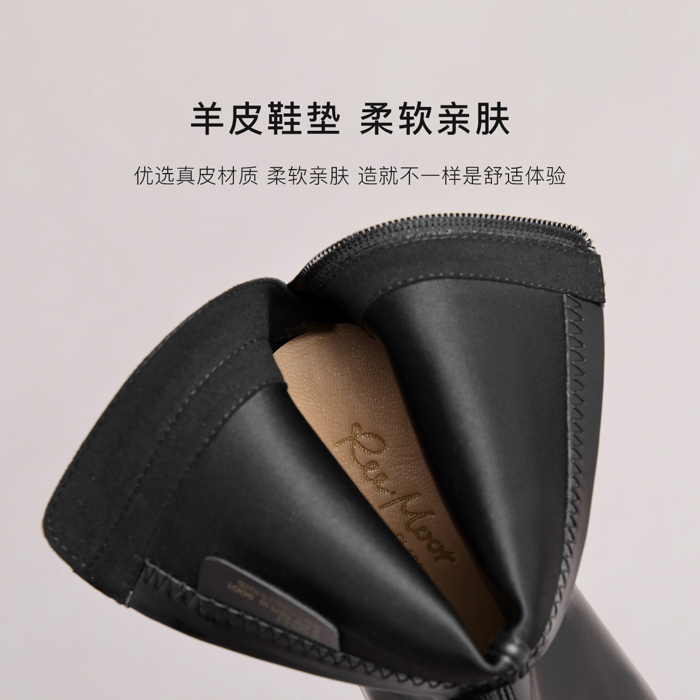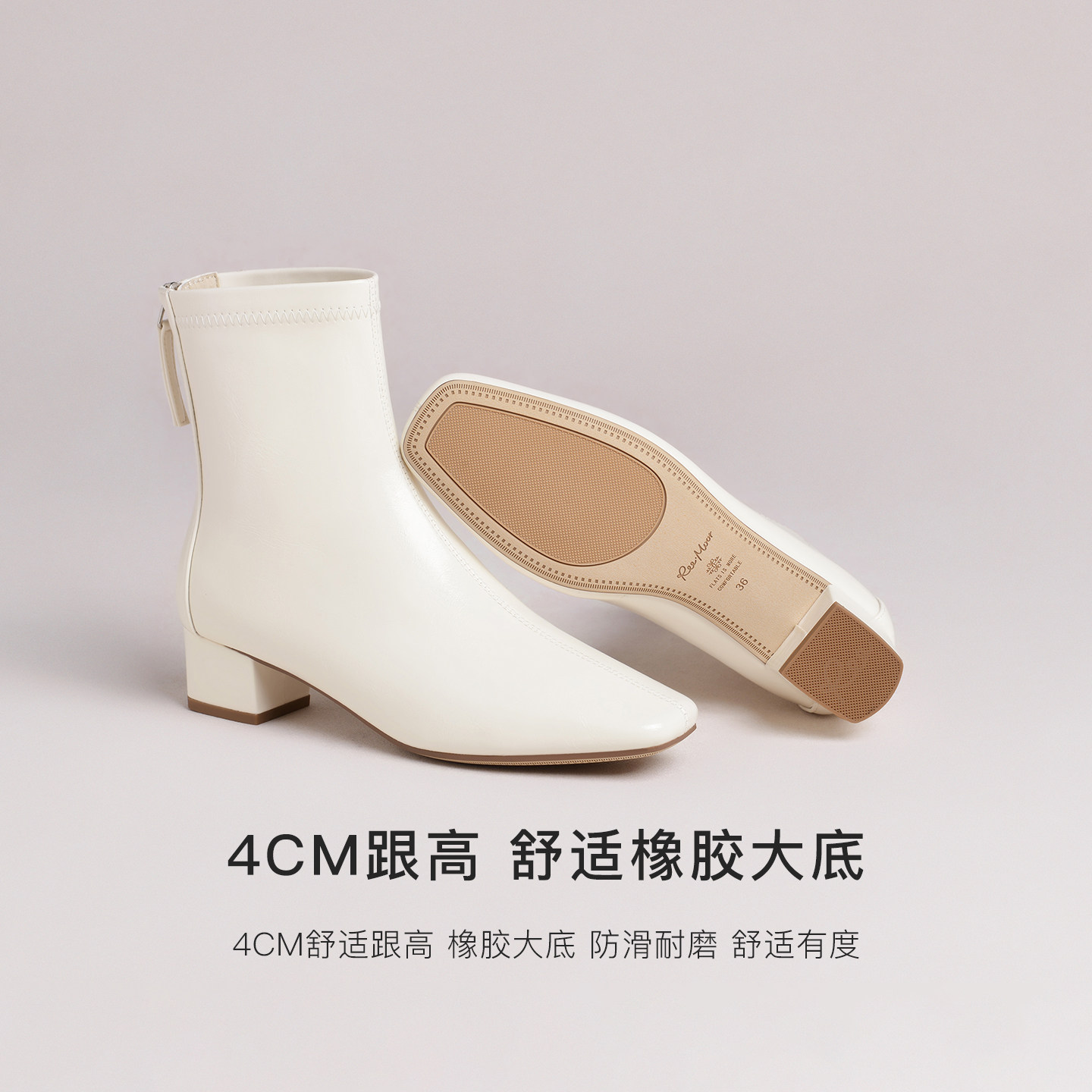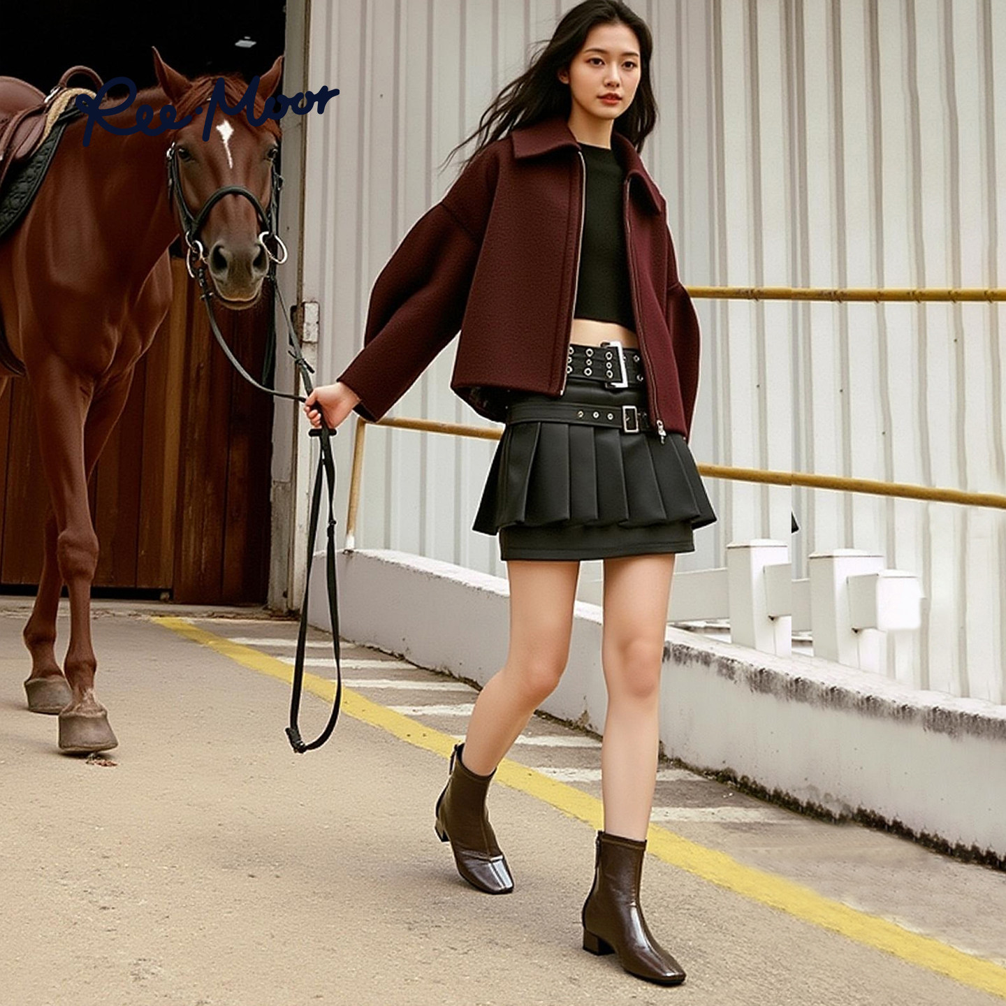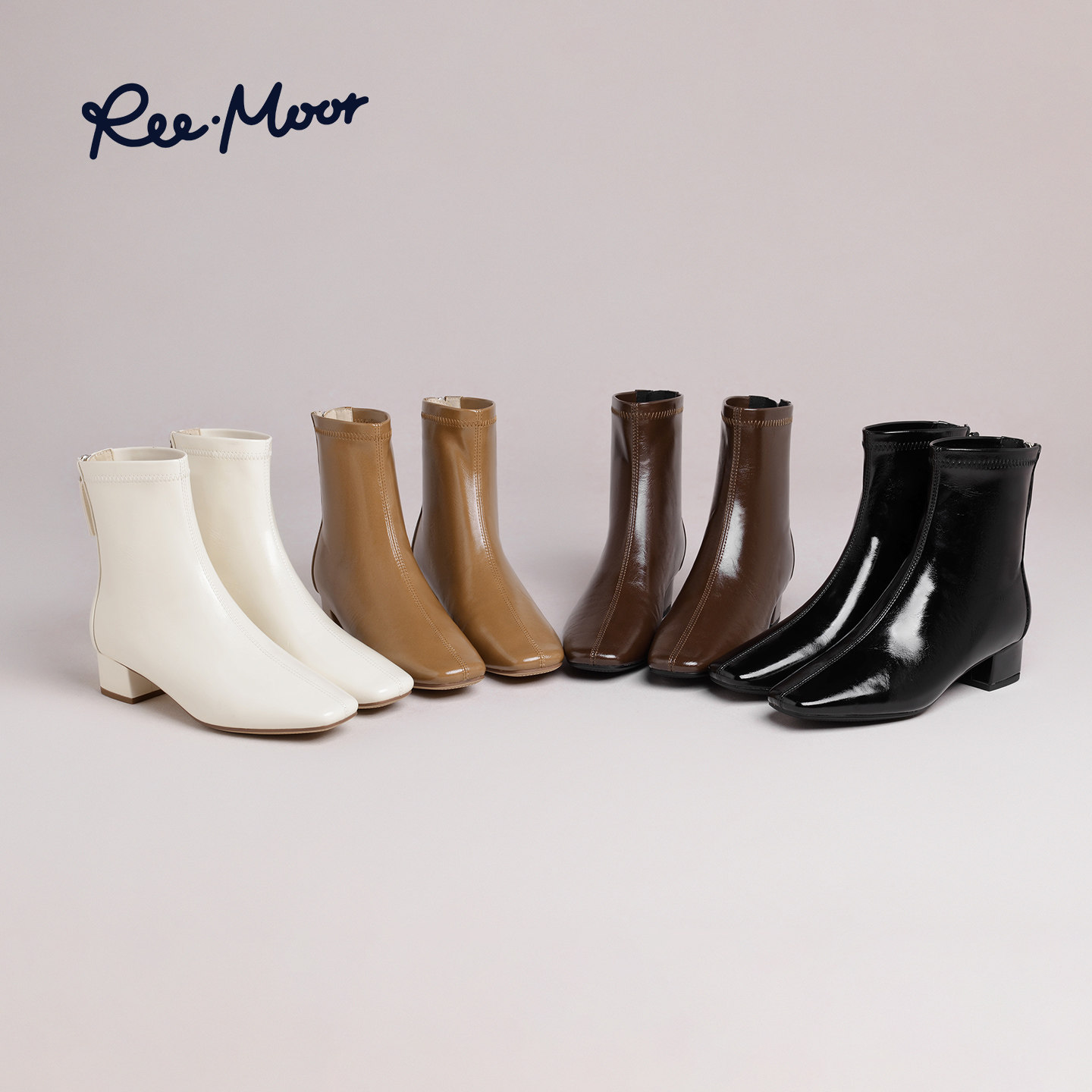 REEMOOR睿慕2025冬季新款法式方头粗跟短靴女皮质瘦瘦靴舒适踝靴