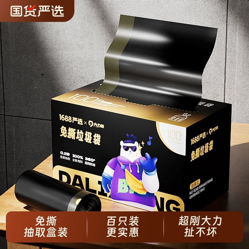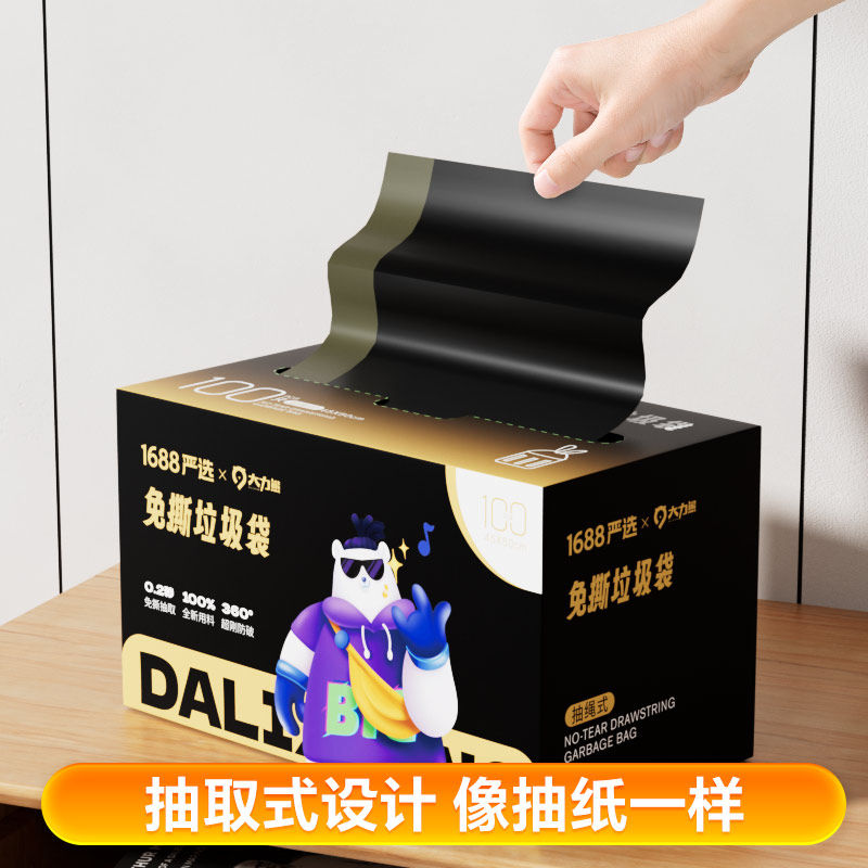 大力熊抽绳垃圾袋家用免撕抽取式盒装加厚大号厨房办公室塑料袋
