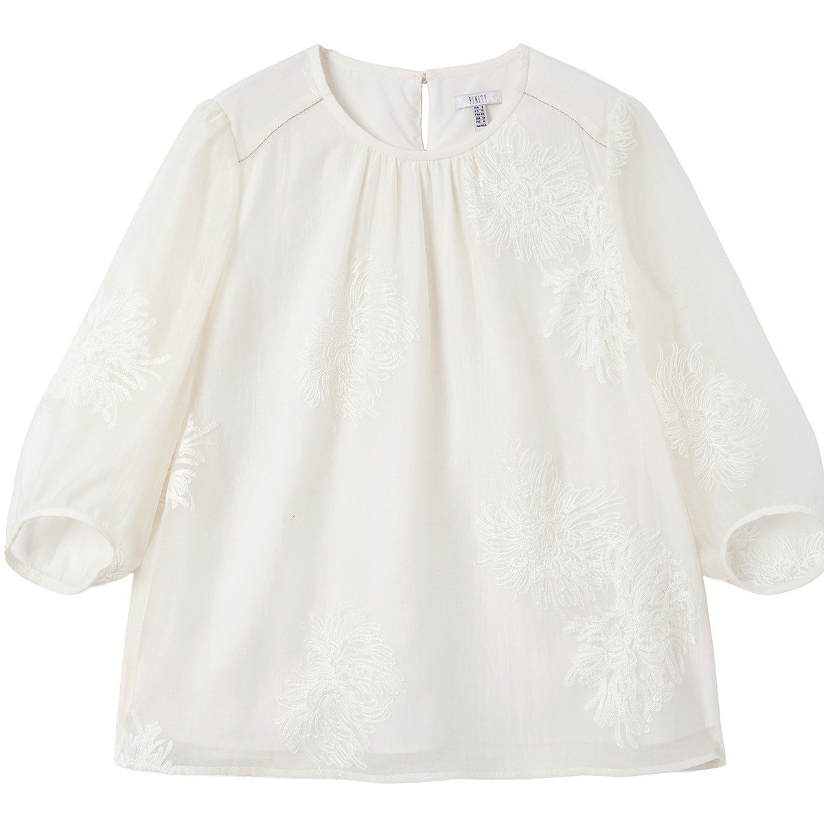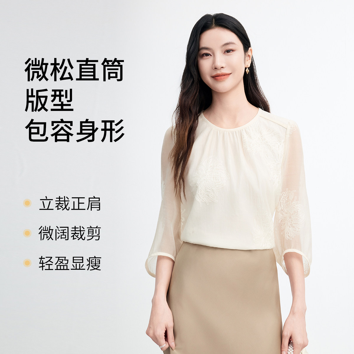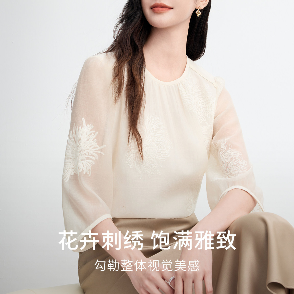 FINITY菲妮迪雪纺衫2026春季新款简约米黄色绣花优雅七分袖上衣女