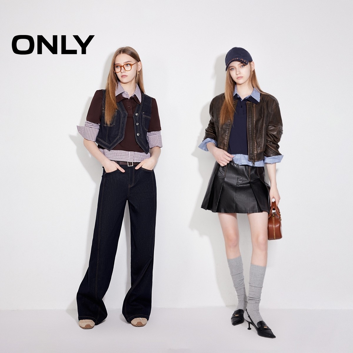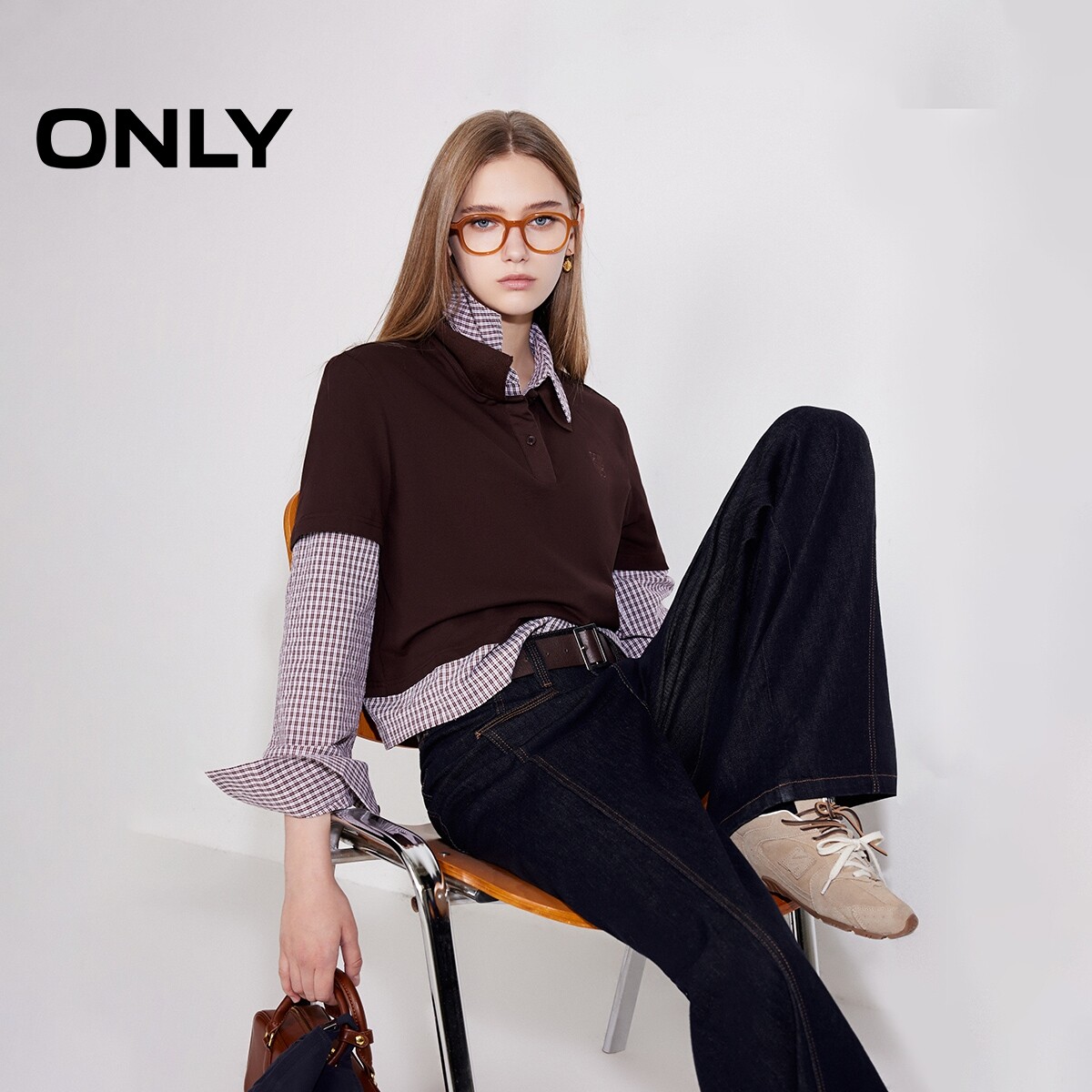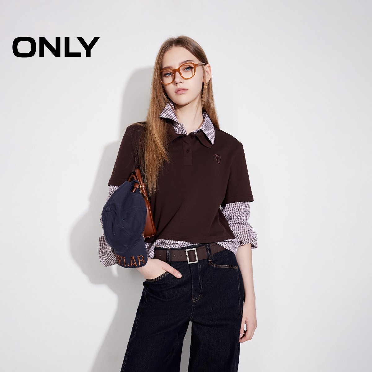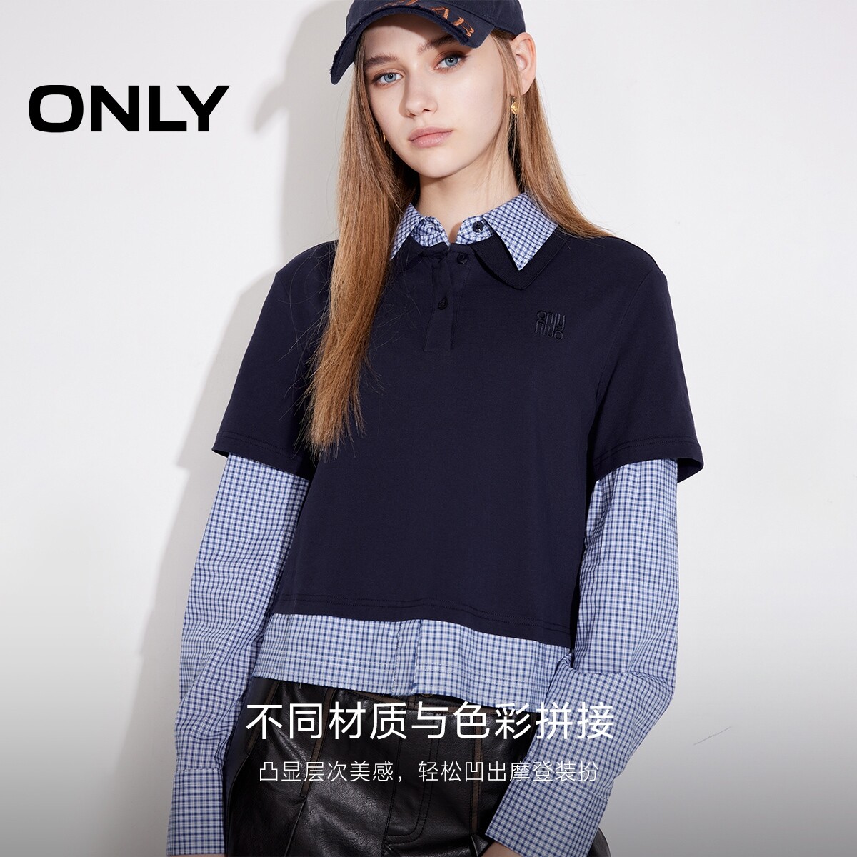 ONLY2026春季新款学院风假两件格纹衬衫蕾丝衫上衣女|125151001