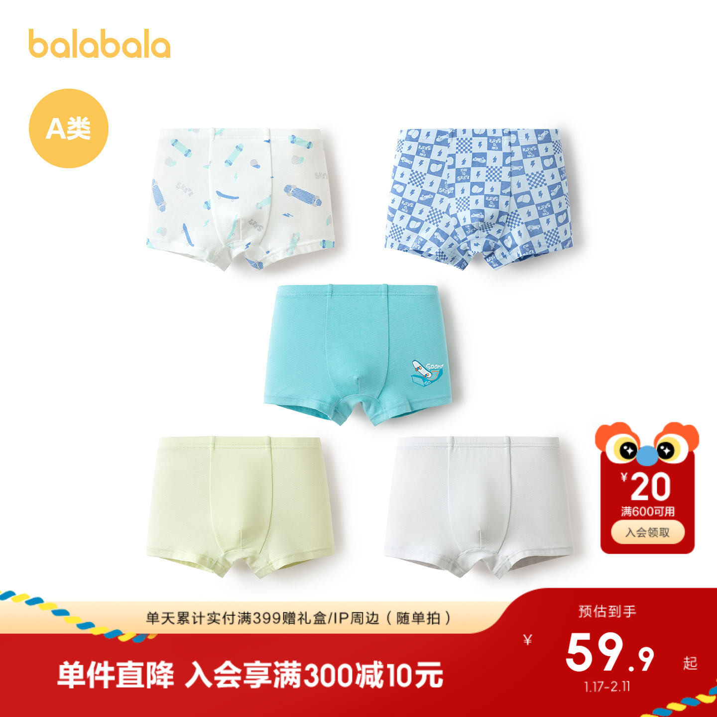 巴拉巴拉男童内裤棉平角儿童四角短裤亲肤小童中大童不夹PP五条装