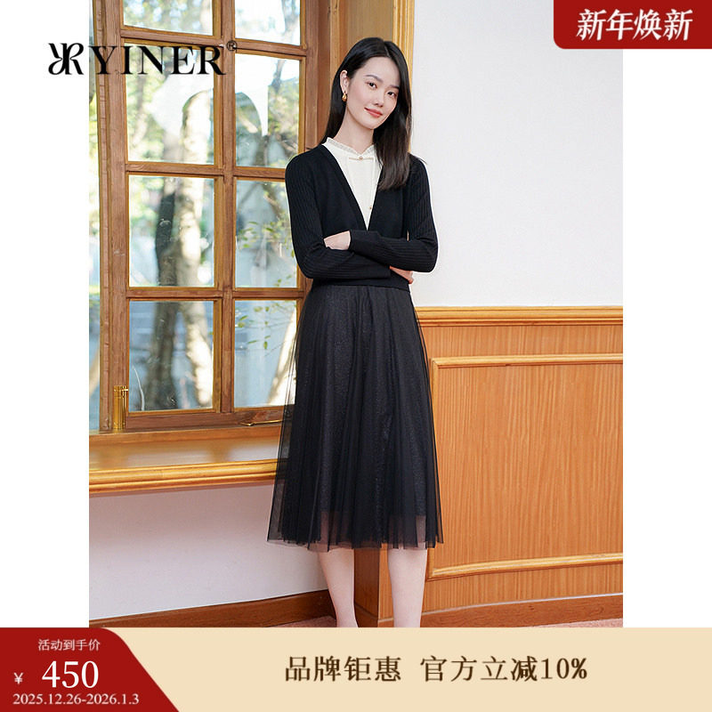 【新中式】YINER音儿专选2025春季新款网纱针织撞色假两件连衣裙