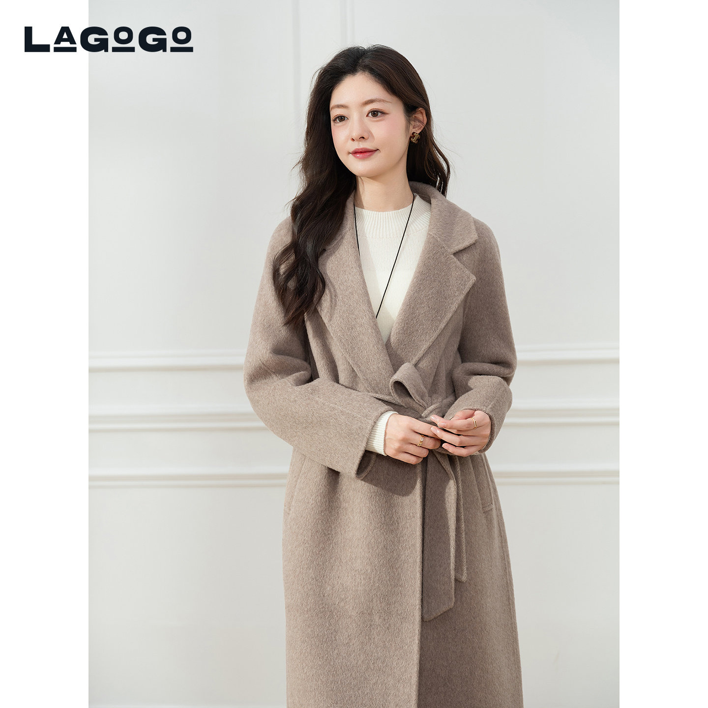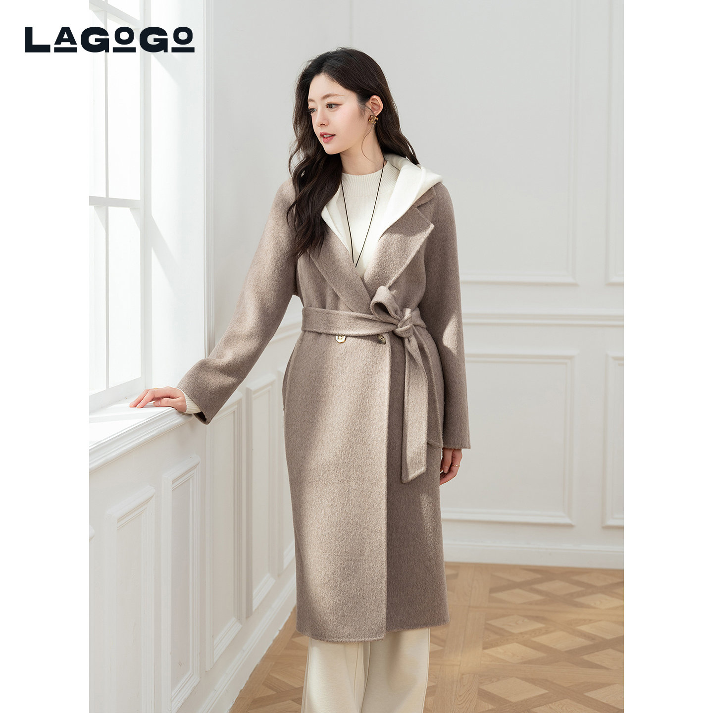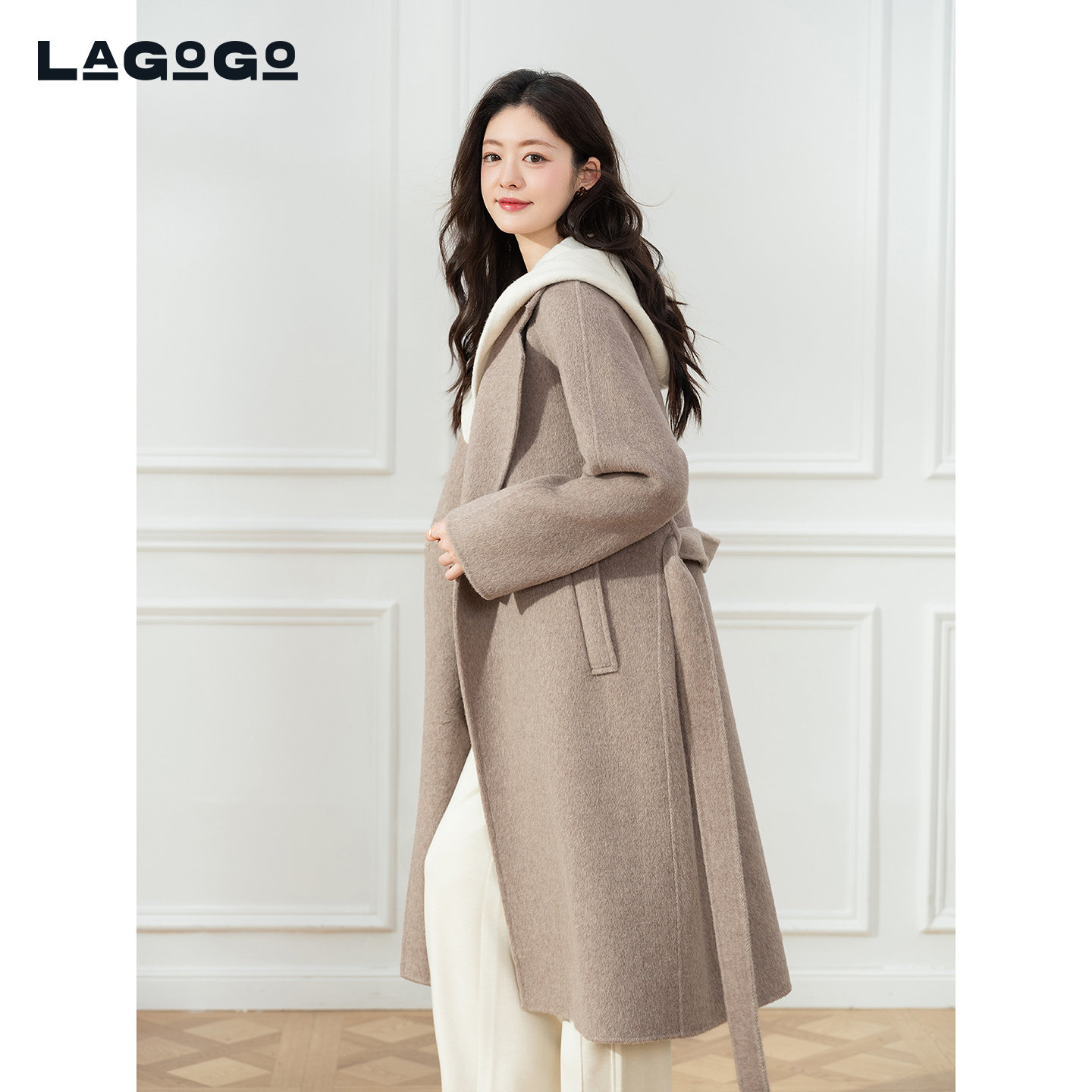 LAGOGO含桑蚕丝双面呢大衣女拉谷谷2025冬可拆连帽外套ODDD33XK61
