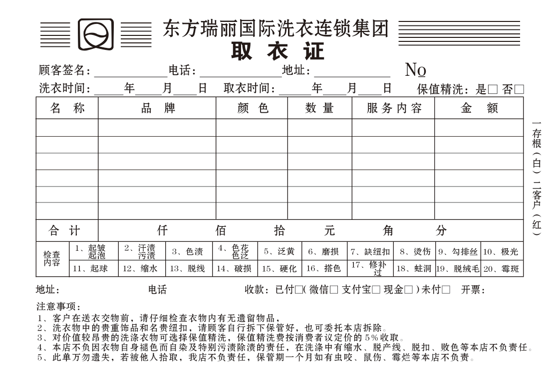 东方瑞俪洗衣取衣单取衣证干洗店洗衣店收衣单据支持定制东方瑞丽