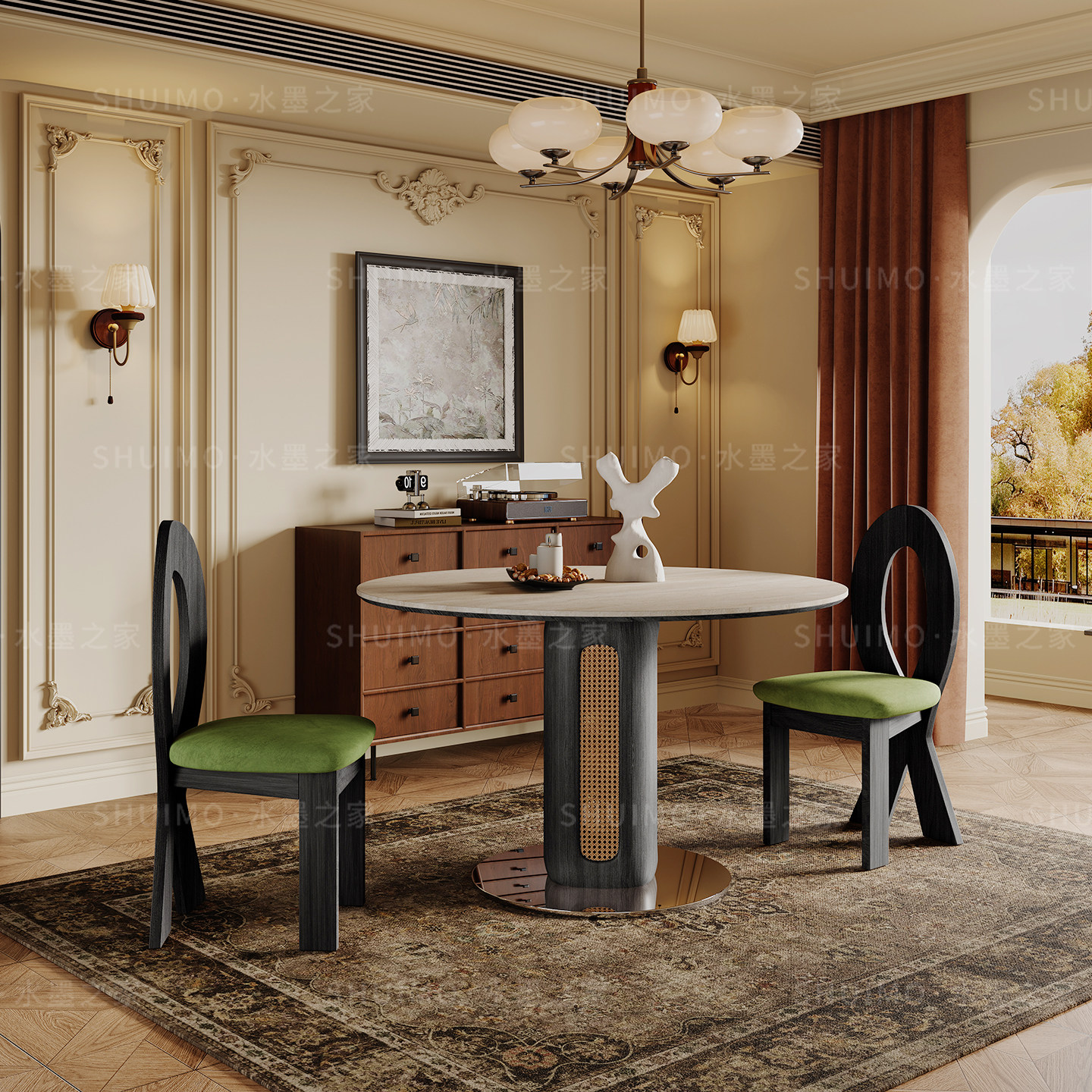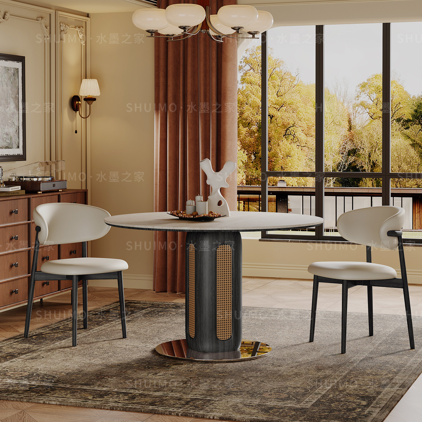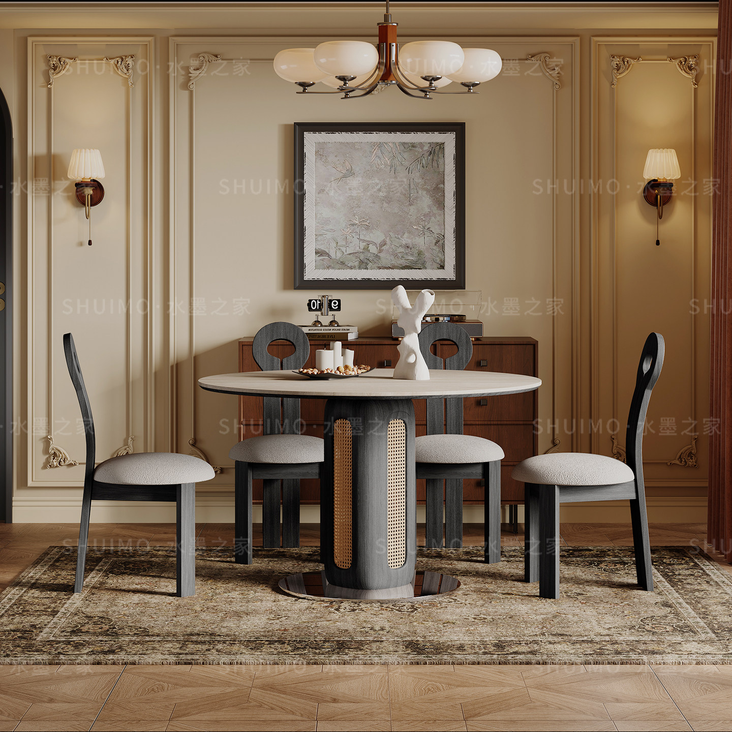 德利丰岩板洞石桌中古圆桌复古编藤腿圆形餐桌法式包豪斯实木饭桌