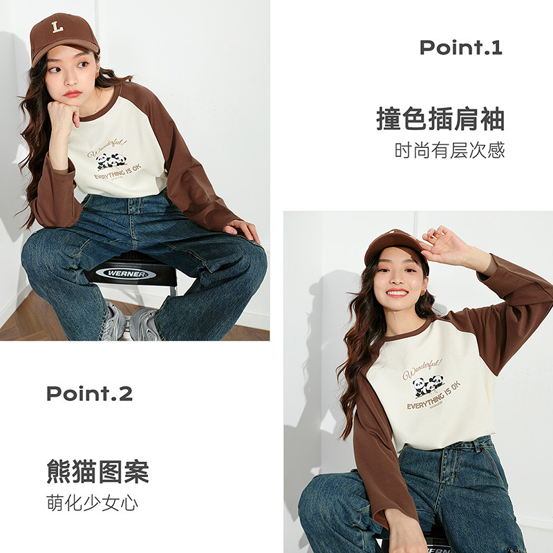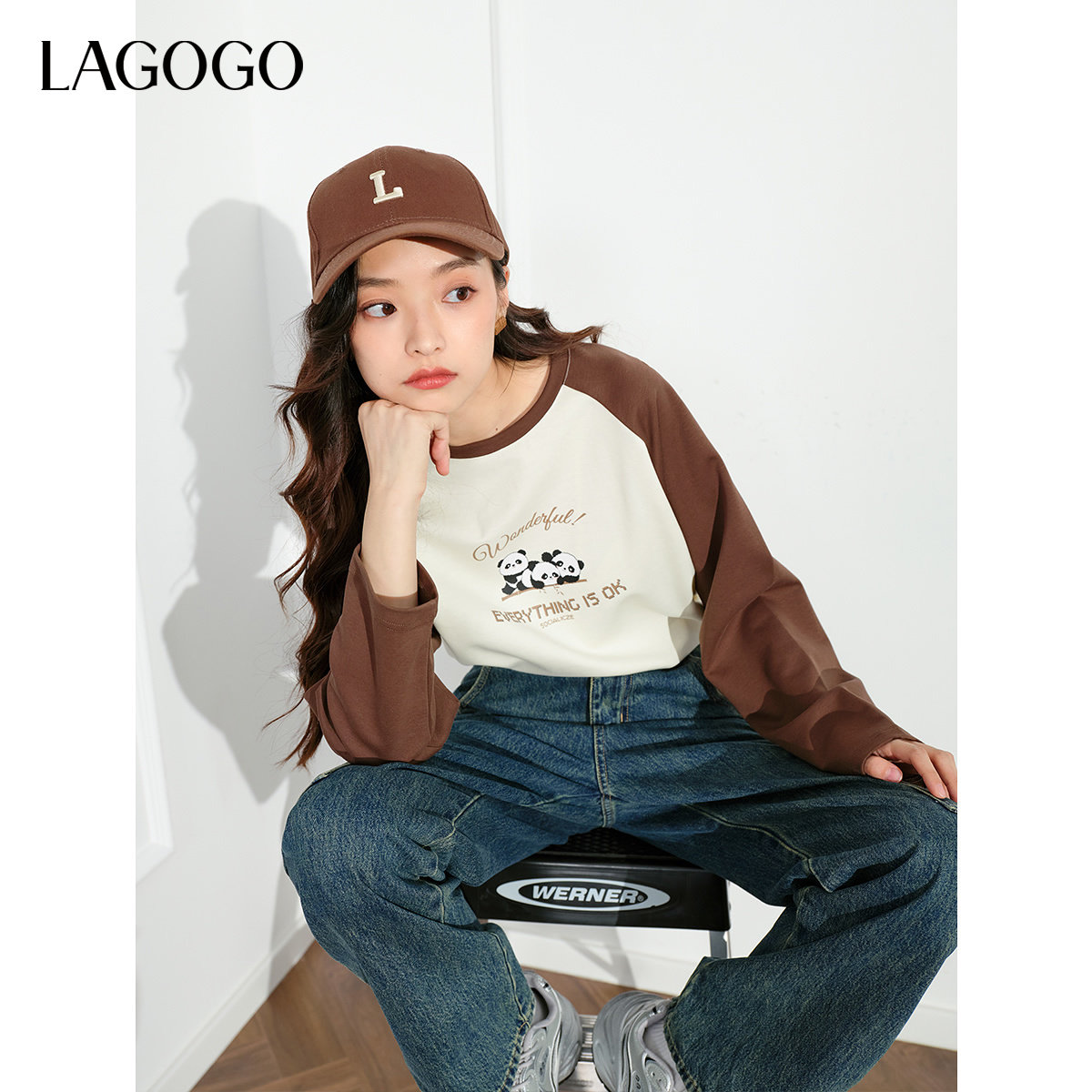 LAGOGO撞色插肩袖T恤衫女拉谷谷春秋新款减龄三熊开怀长袖上衣