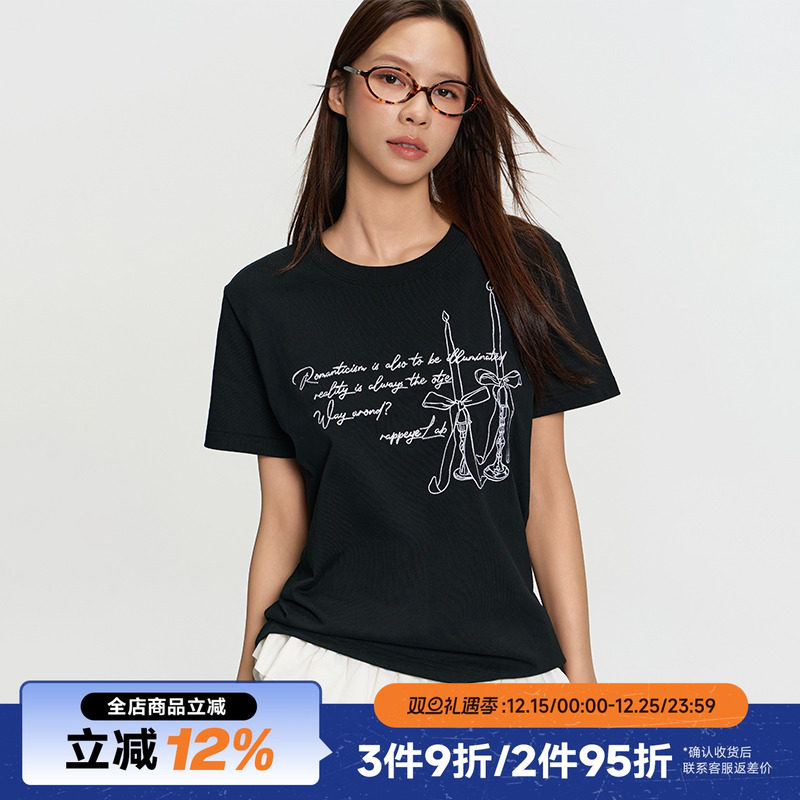 RAPPEYE 蝴蝶结烛台短袖宽松百搭时尚设计感复古圆领刺绣印花T恤