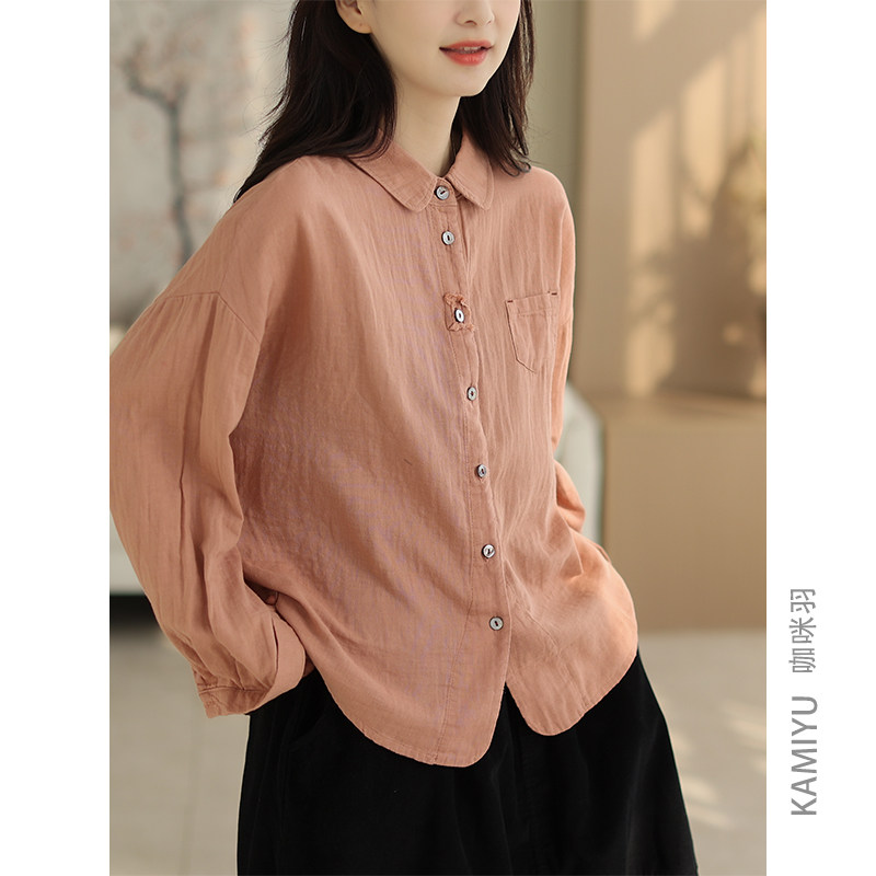 咖咪羽双层棉纱纯色衬衫女秋季新款宽松文艺百搭长袖打底衬衫