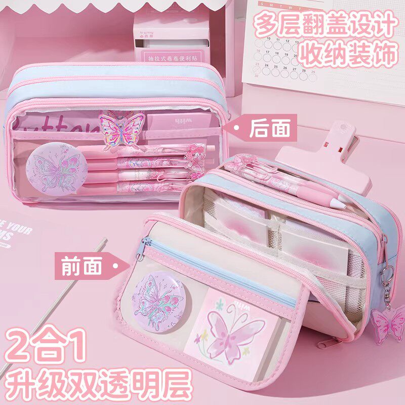 13层铃兰蝴蝶~2026新款大容量笔袋女生新款超火2026高颜值ins文具盒女孩款小学生透明铅笔盒初中不撞款文具袋