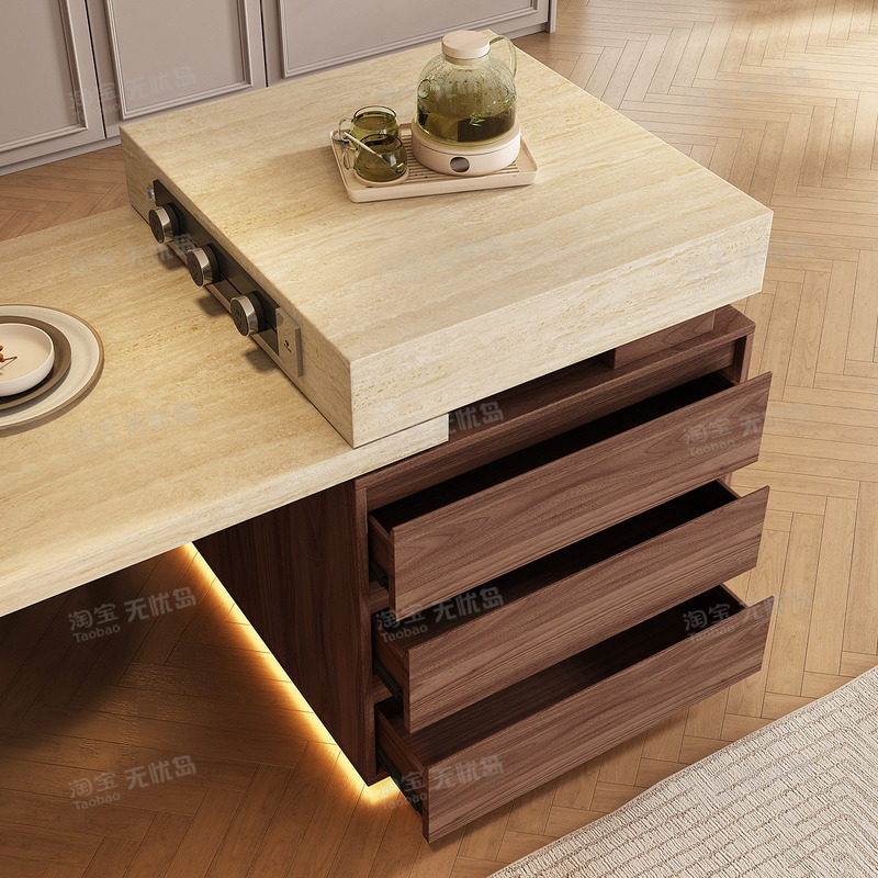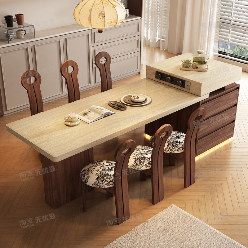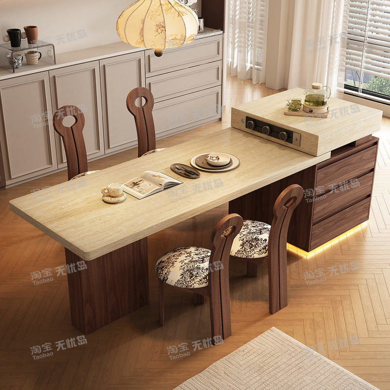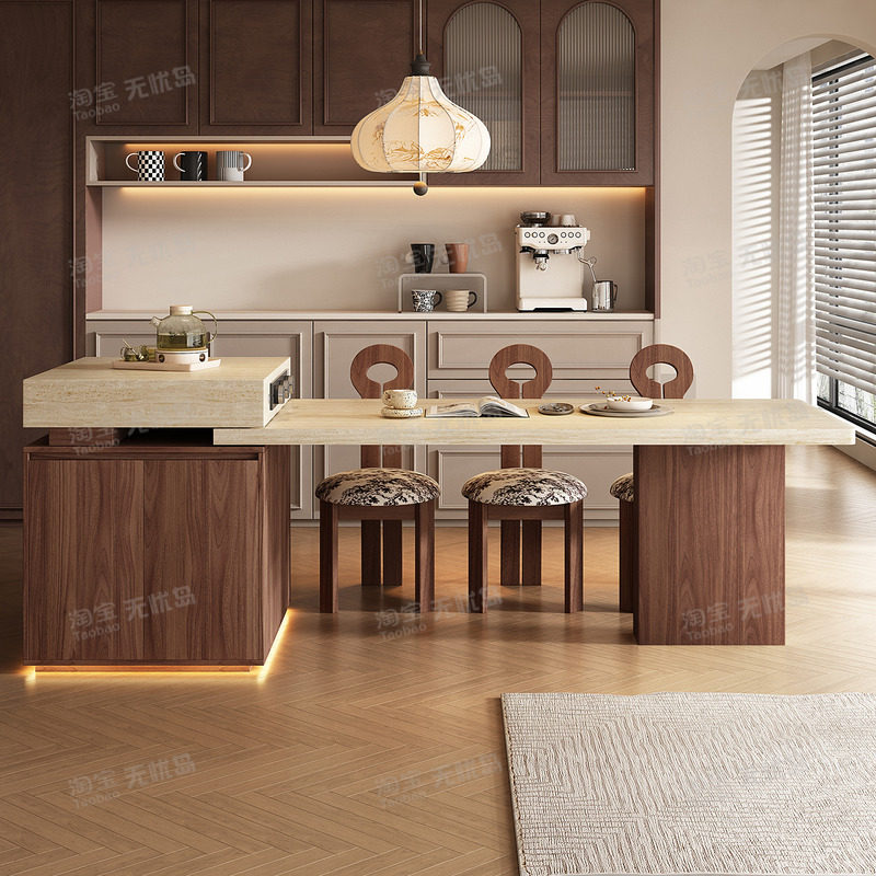 中古风胡桃木色岛台餐桌一体家用可伸缩小户型倒洞石高端岩板导台