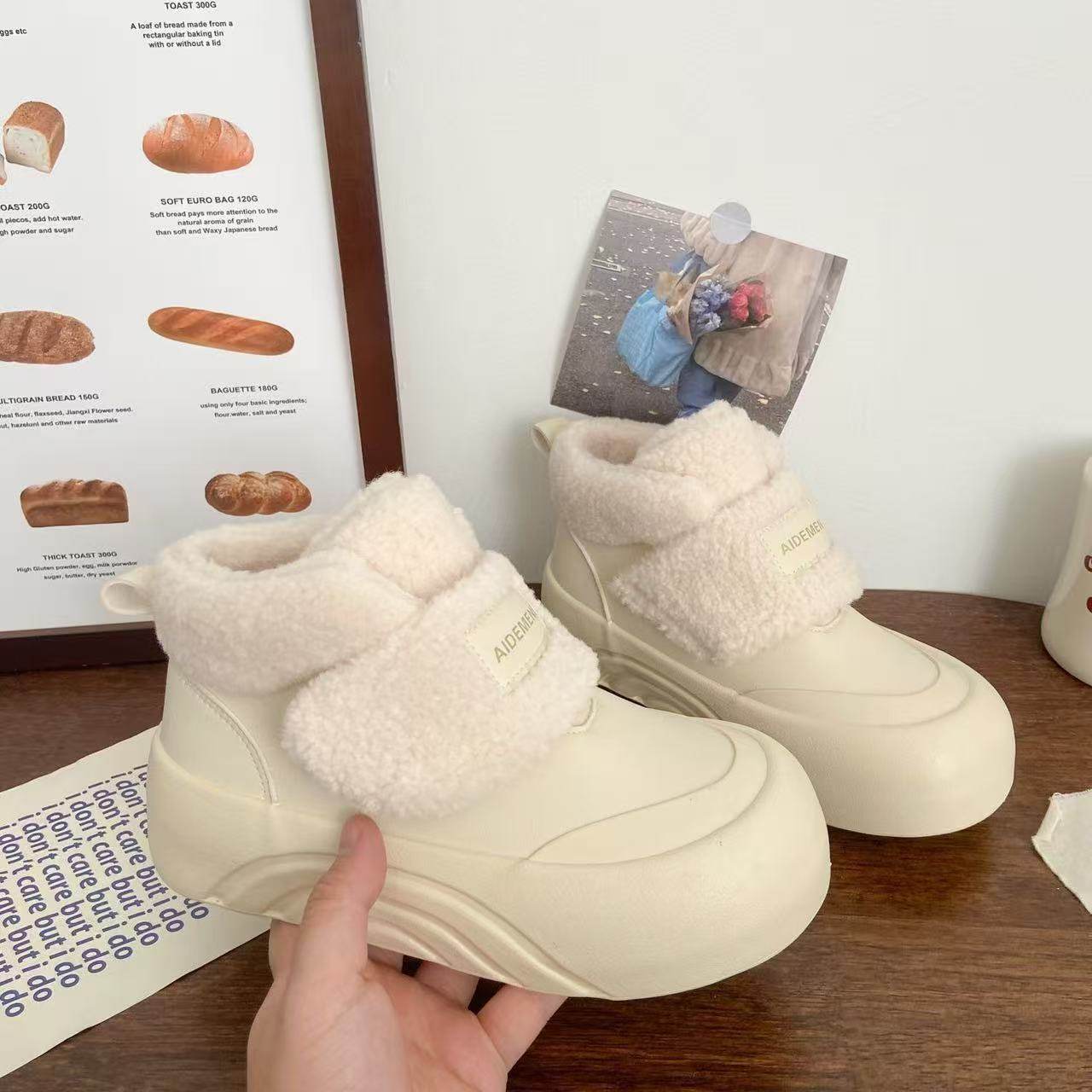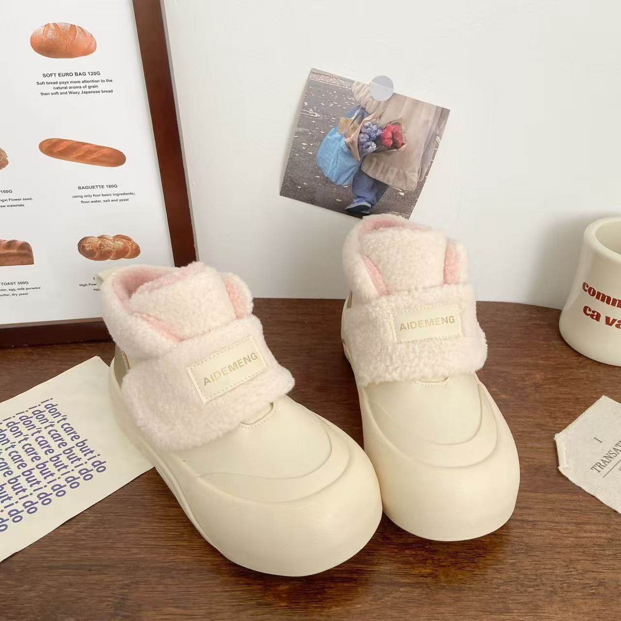 粉色加绒高帮小白鞋女丑萌冬季新款chic小众棉鞋厚底大头面包鞋子
