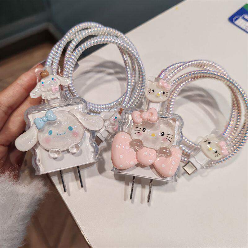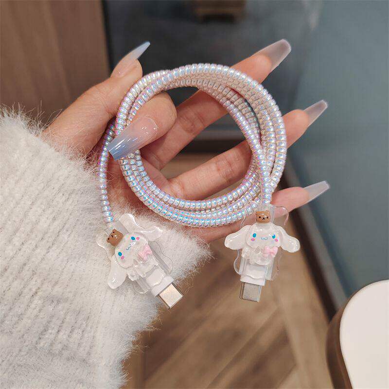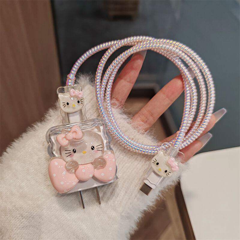 粉色领结猫充电器数据线保护套防折断苹果通用卡通防摔玉桂狗整套