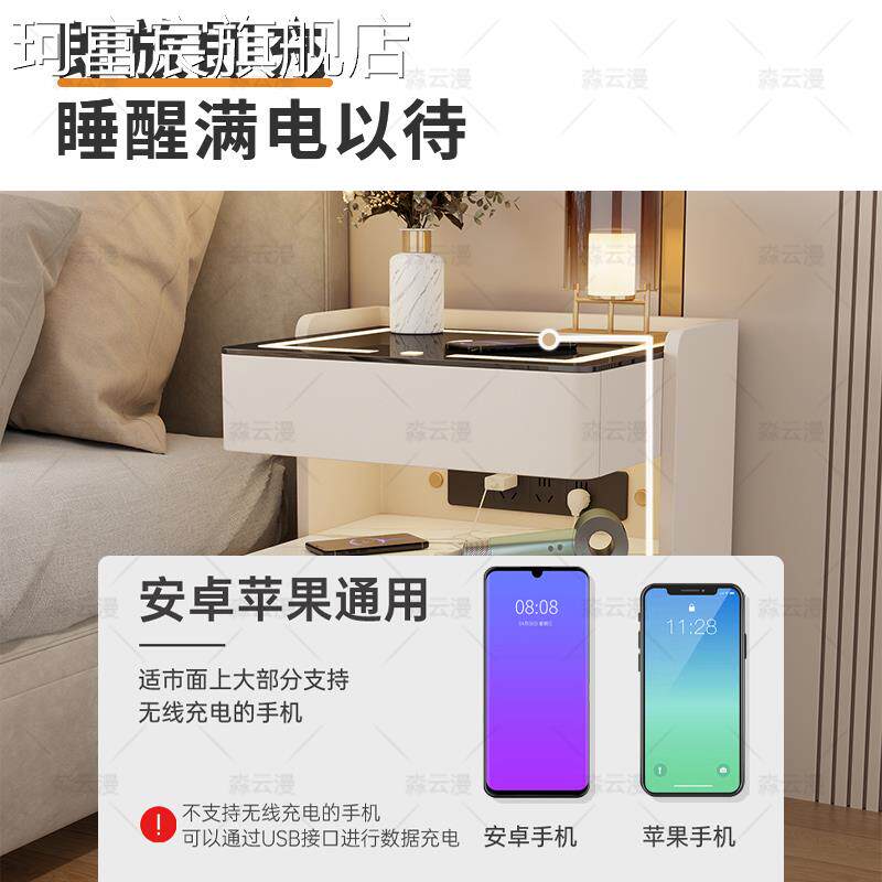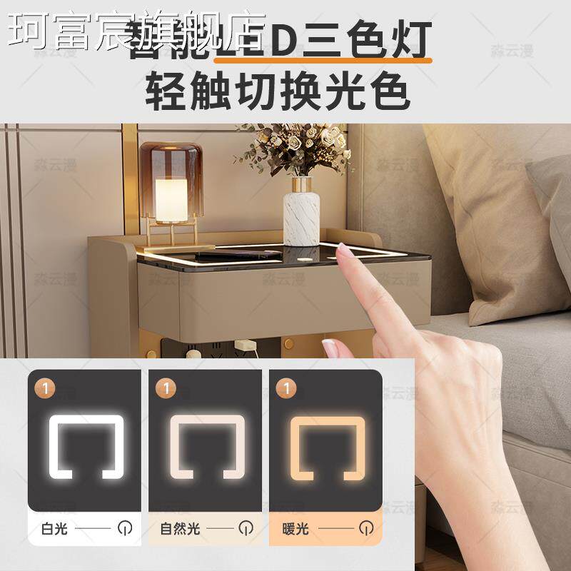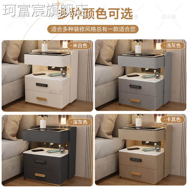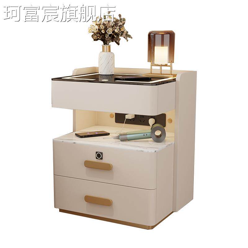 珂富宸轻奢实木智能床头柜简约现代免安装家用多功能卧室岩板充电床边柜摆件饰品床笠拉车盖布