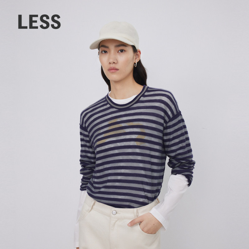 LESS绵羊毛薄款针织衫女休闲圆领经典条纹简约圆领上衣2O1313970