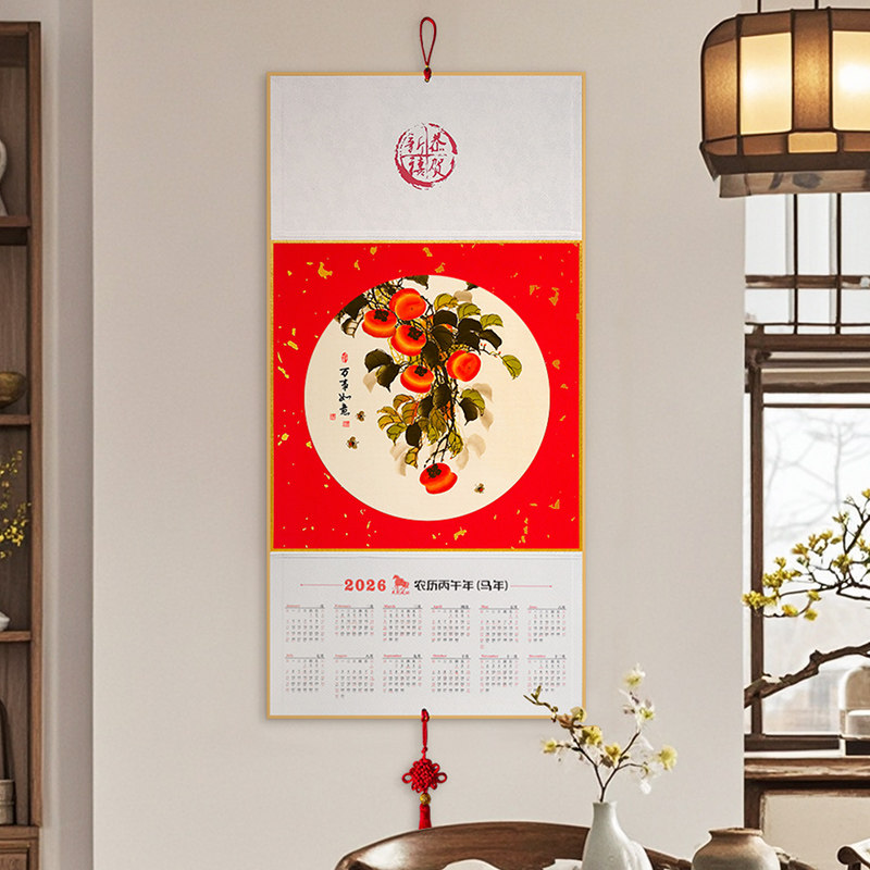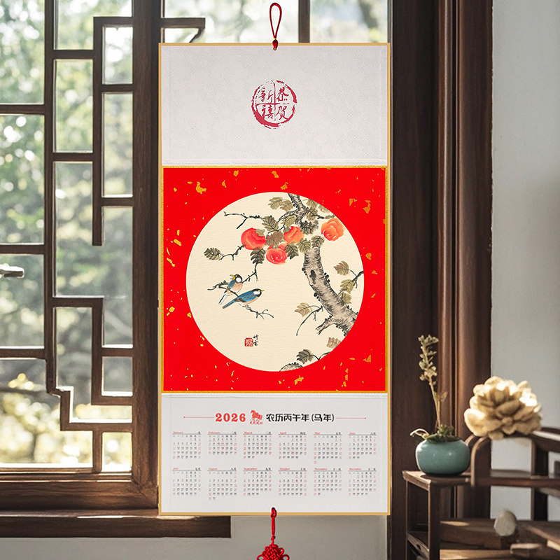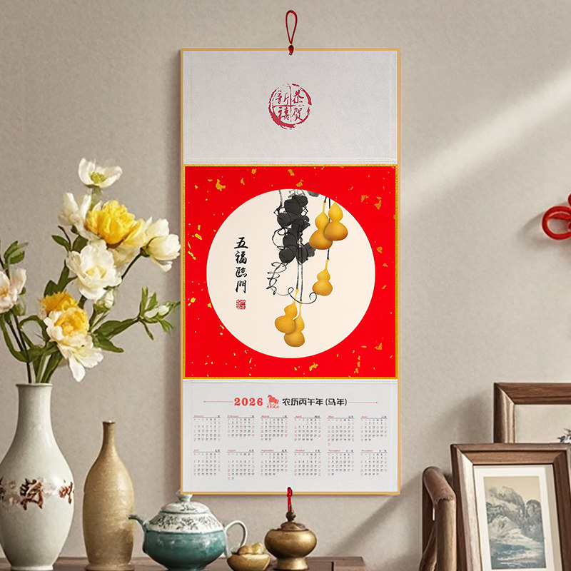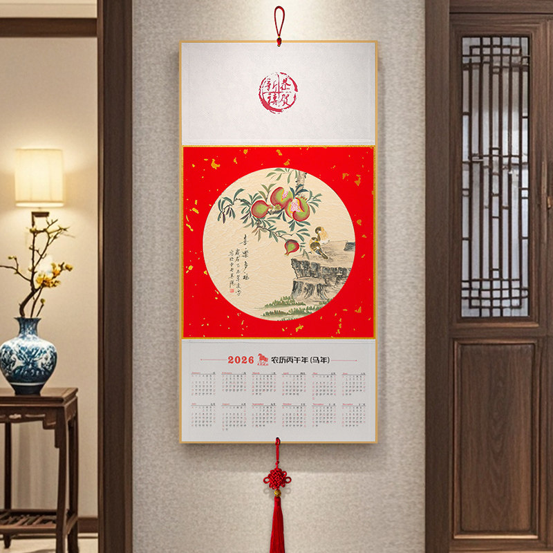 2026年宣纸折叠挂历事事如意装饰画免装裱日历卡纸国画书法创作手写福字圆形万年红硬卡纸文房挂件可定制批发