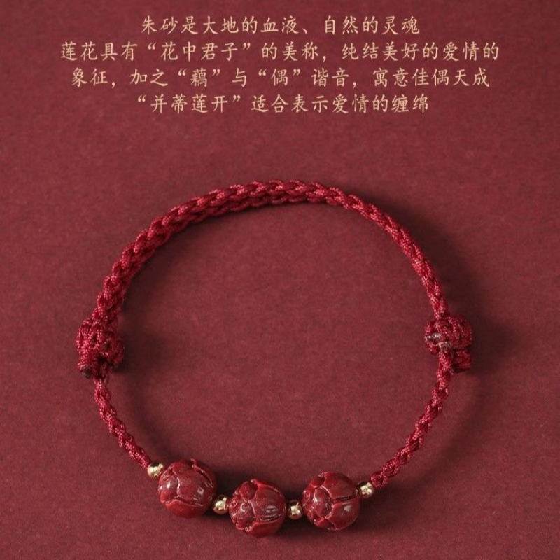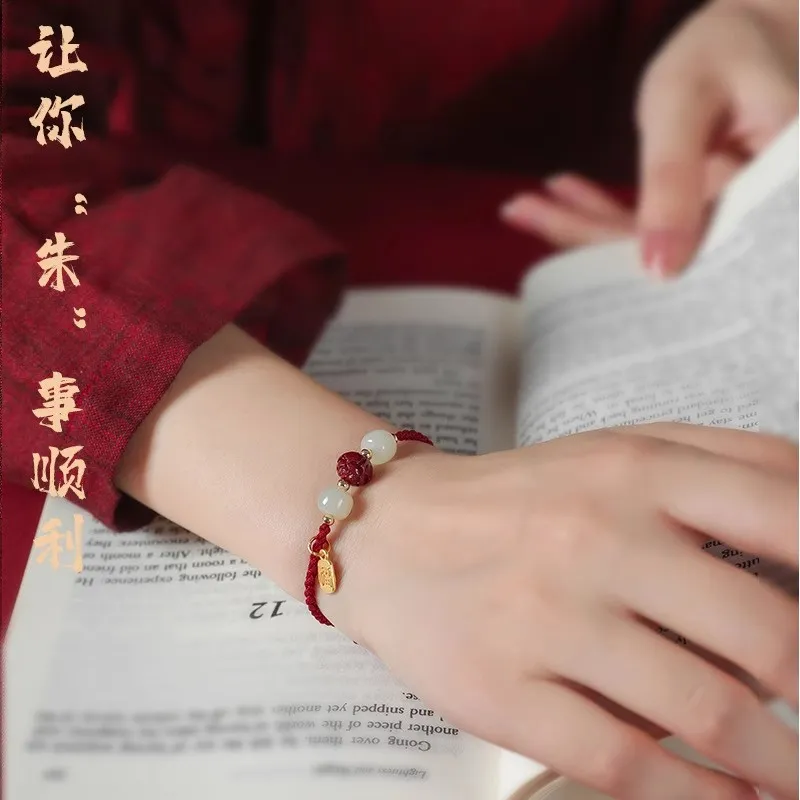 中国风考研上岸手链女本命年手饰红绳朱砂和田玉福牌编织莲花手绳