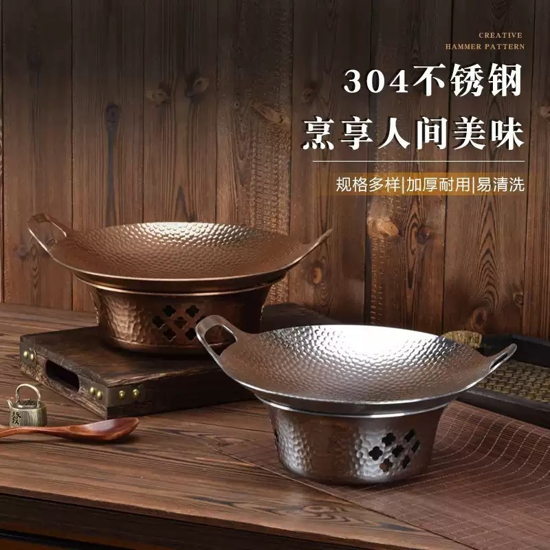 304加厚不锈钢干锅锅具商用酒精炉加热锤纹锅仔餐具湘菜麻辣香锅