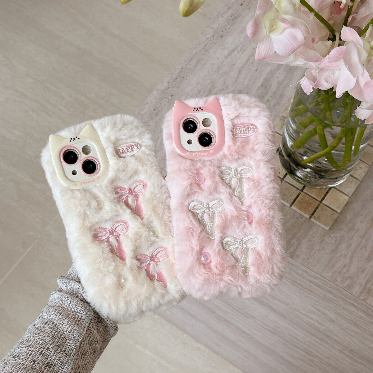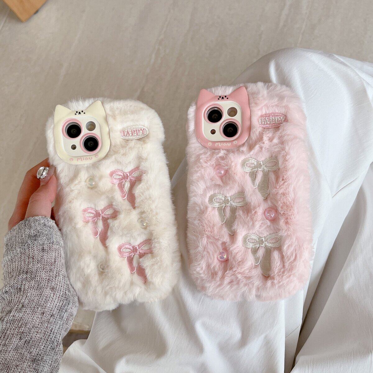 猫耳立体珍珠刺绣蝴蝶结飘带毛绒壳冬天保暖适用于苹果17时尚手机壳苹果16粉嫩15少女心手机壳新款14仙女壳13