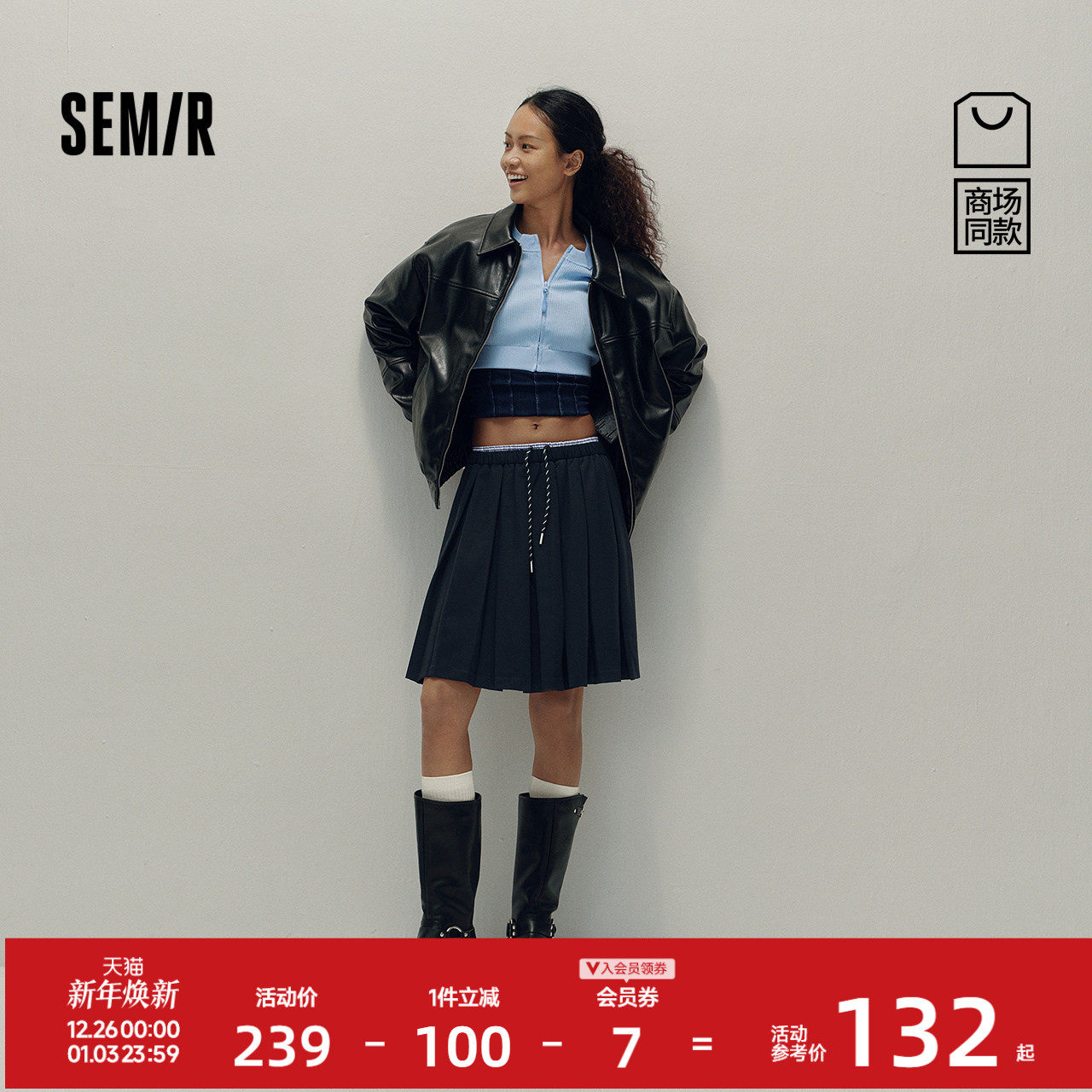 [商场同款]森马半身裙女学院风撞色松紧腰秋季2025新款高腰百褶裙