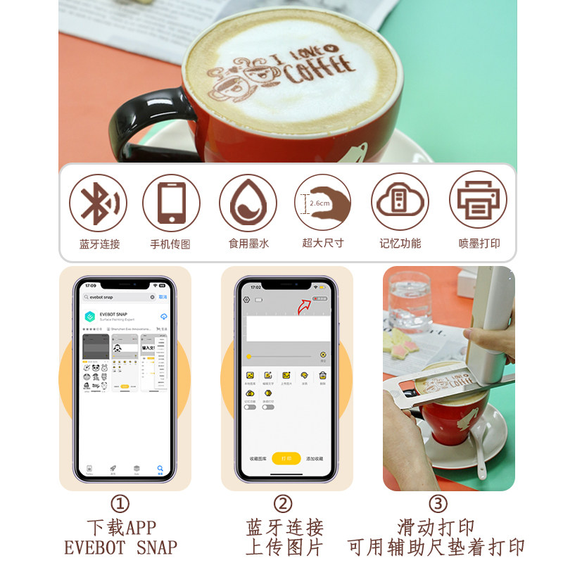 evebot亿瓦手持可食用食品打印机餐饮食物咖啡拉花美食图案打印机