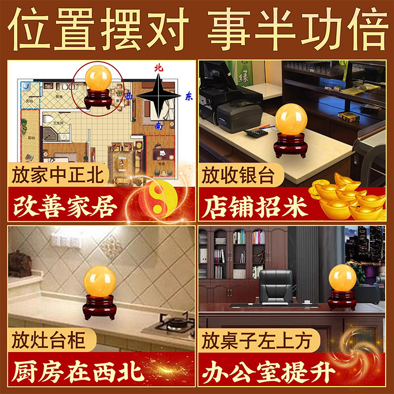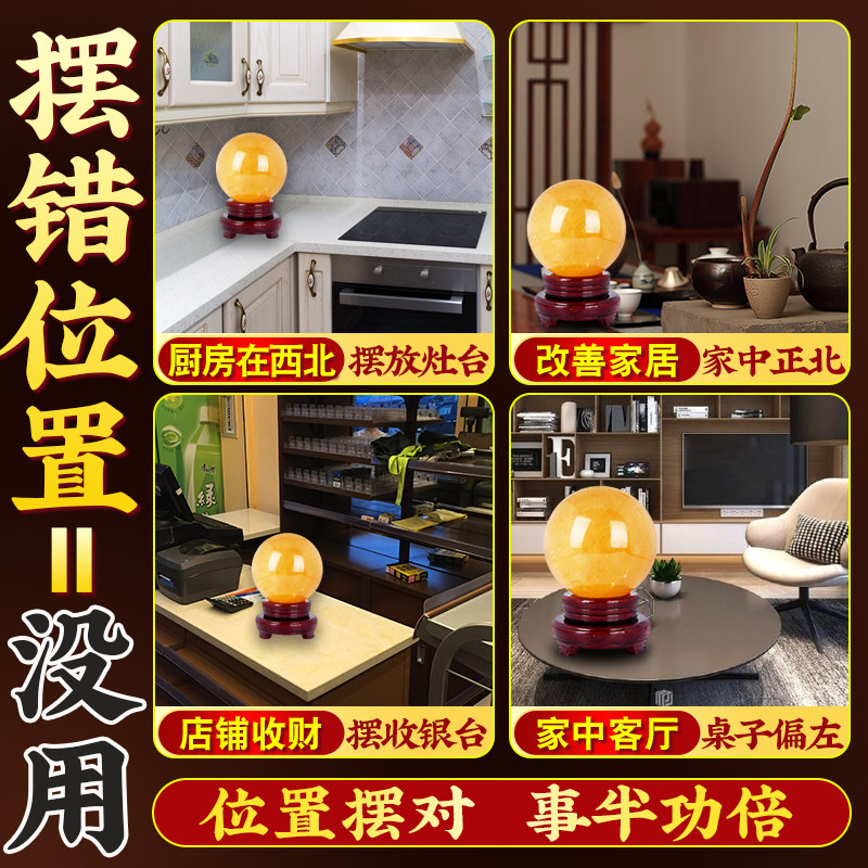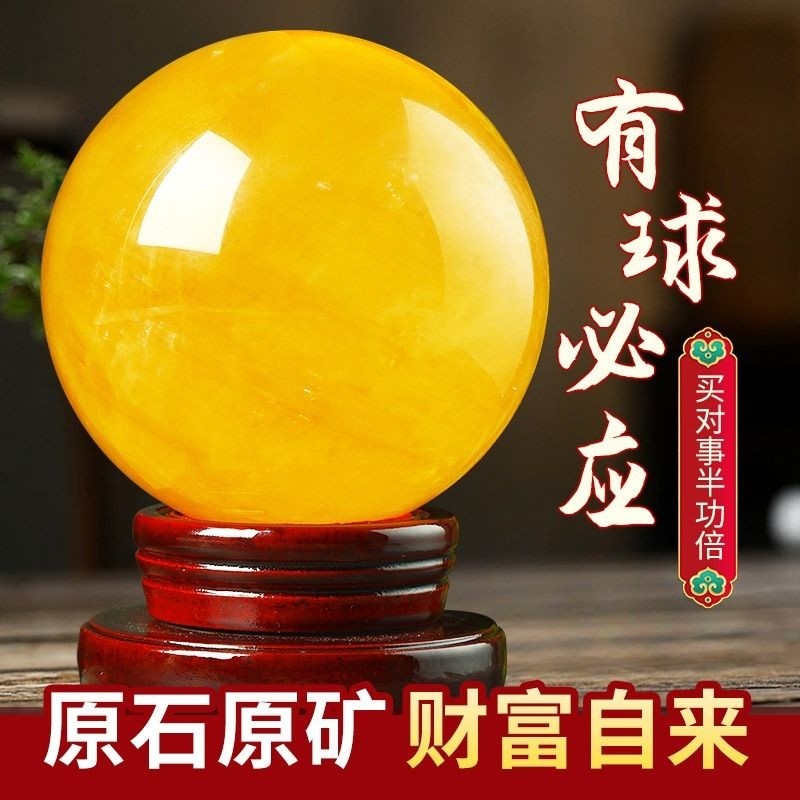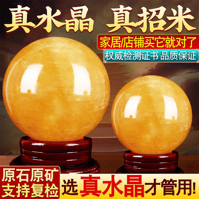 天然黄色水晶球摆件原矿方解石招聚财客厅开业装饰品办公室厨房