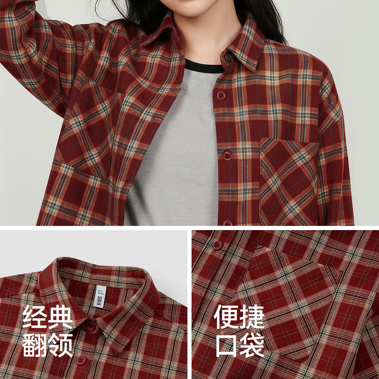 森马长袖衬衫女春季中长款oversize翻领落肩格纹上衣女生复古衬衣