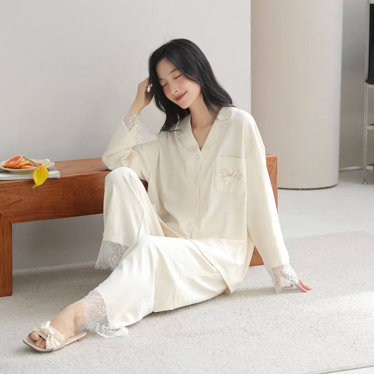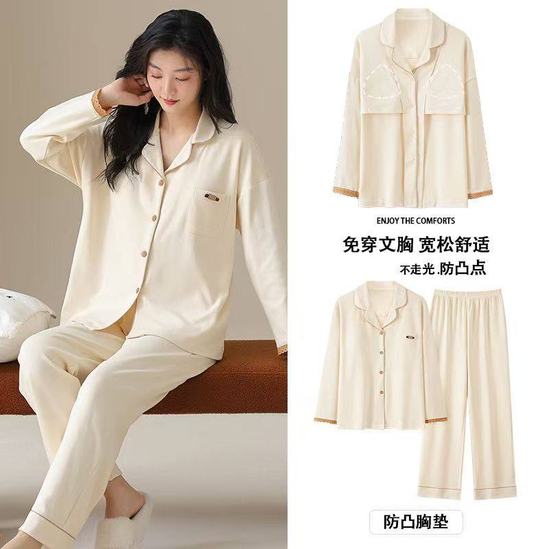 带胸垫睡衣女长袖春秋可外穿新款大码开衫秋季家居服套装纯棉春夏