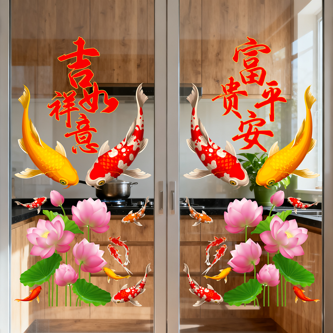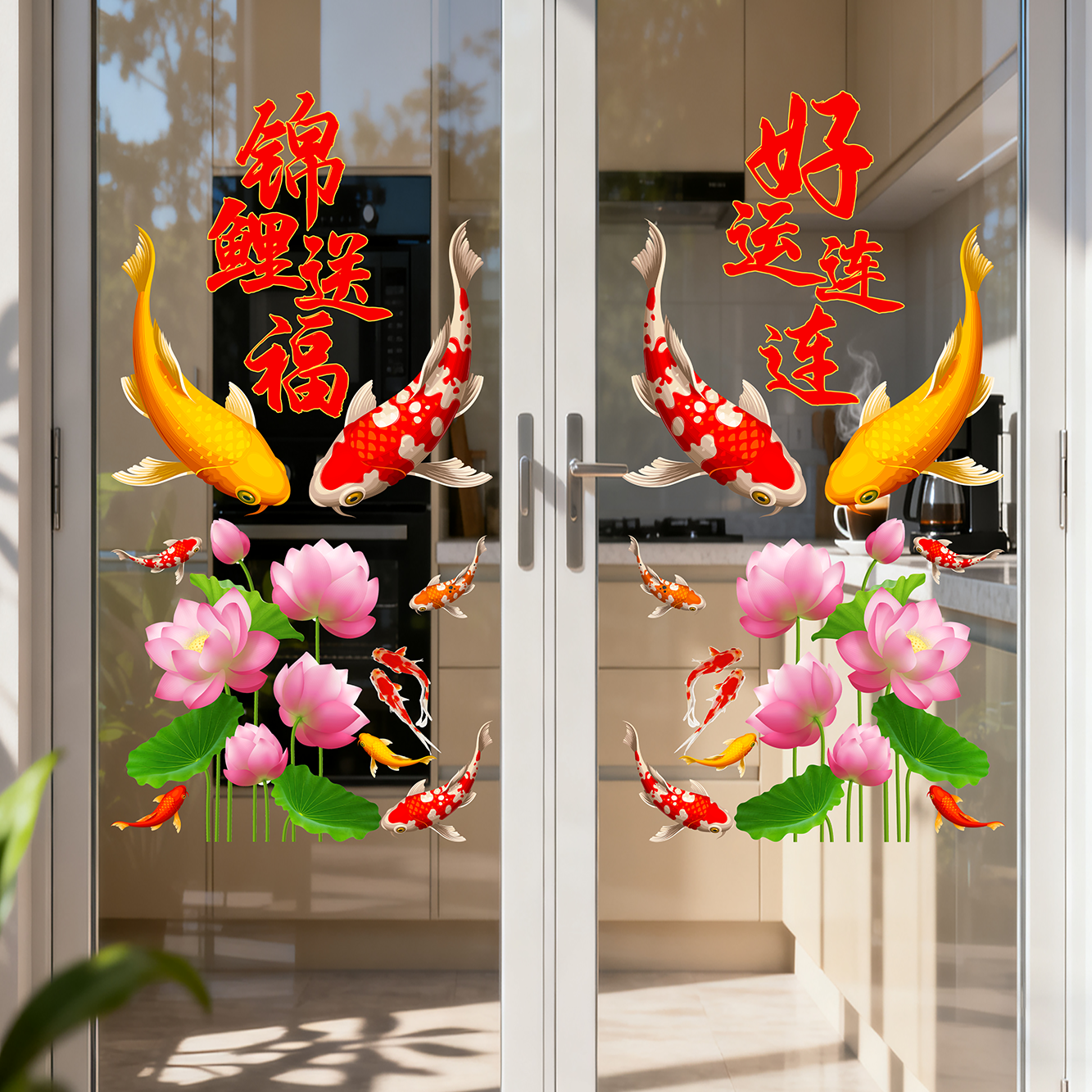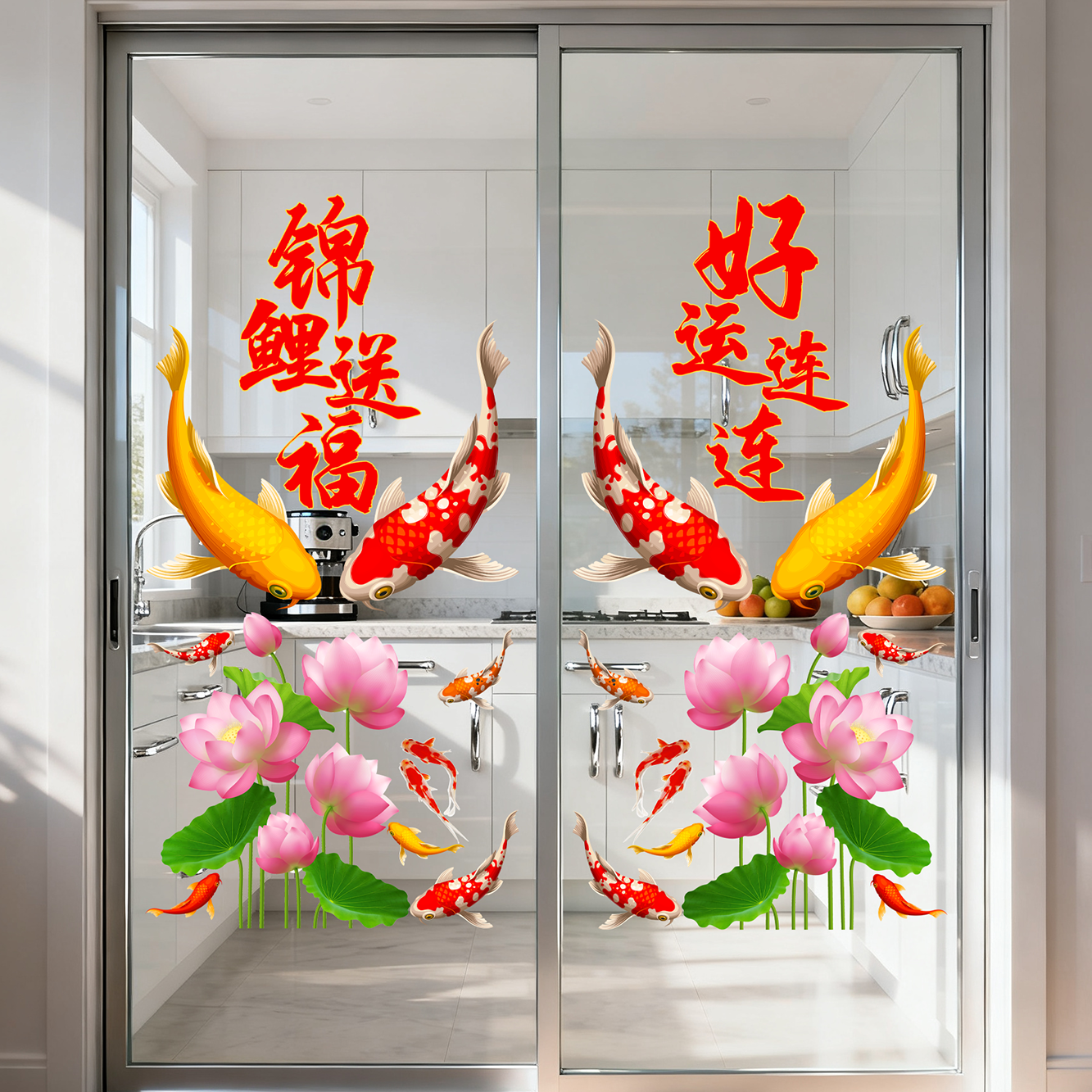 年年有余锦鲤荷花玻璃贴纸厨房门窗装饰防撞贴画新年春节静电贴