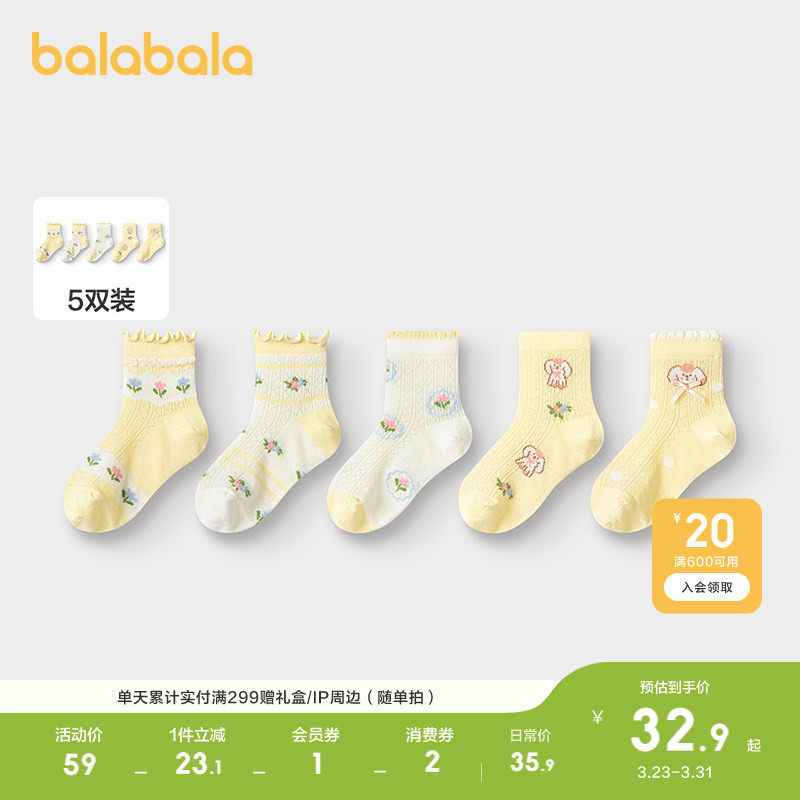 巴拉巴拉女童袜子儿童网眼袜夏中幼童甜美提花柔弹亲肤舒适五双装
