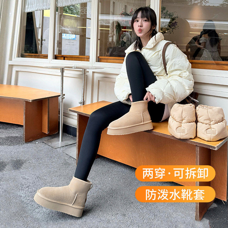 油叽叽~真皮羊毛雪地靴女冬季加绒加厚保暖棉靴厚底增高短筒靴子