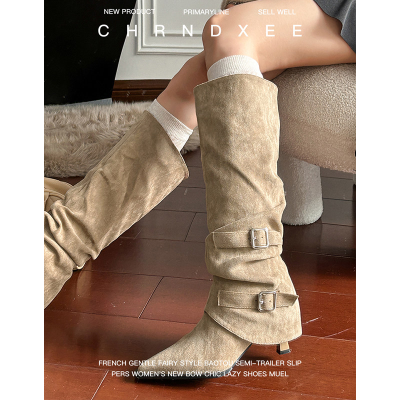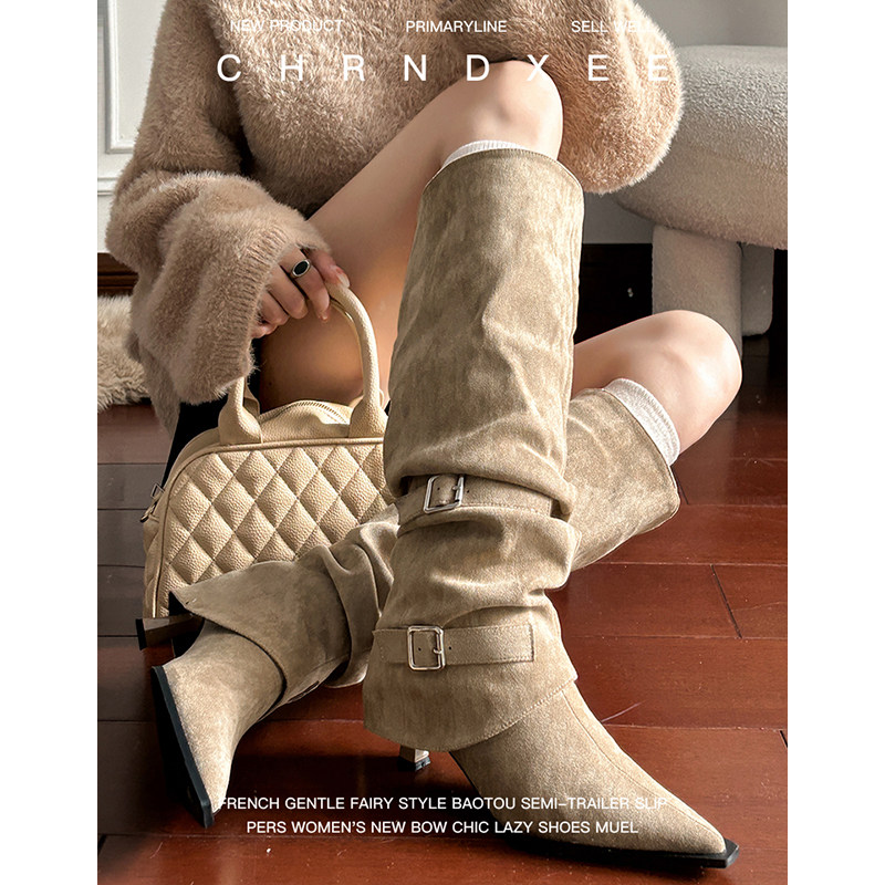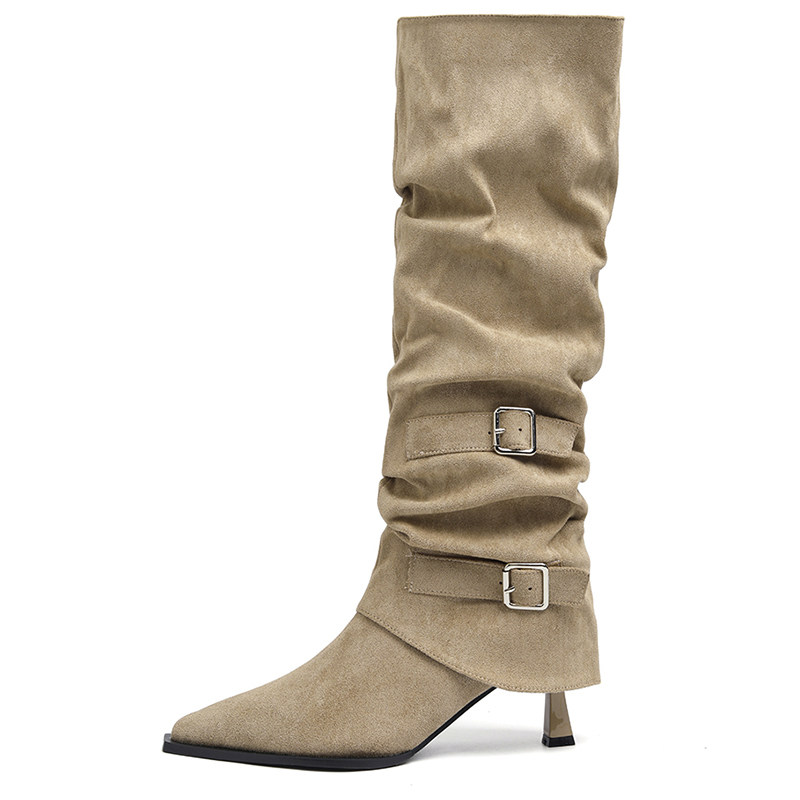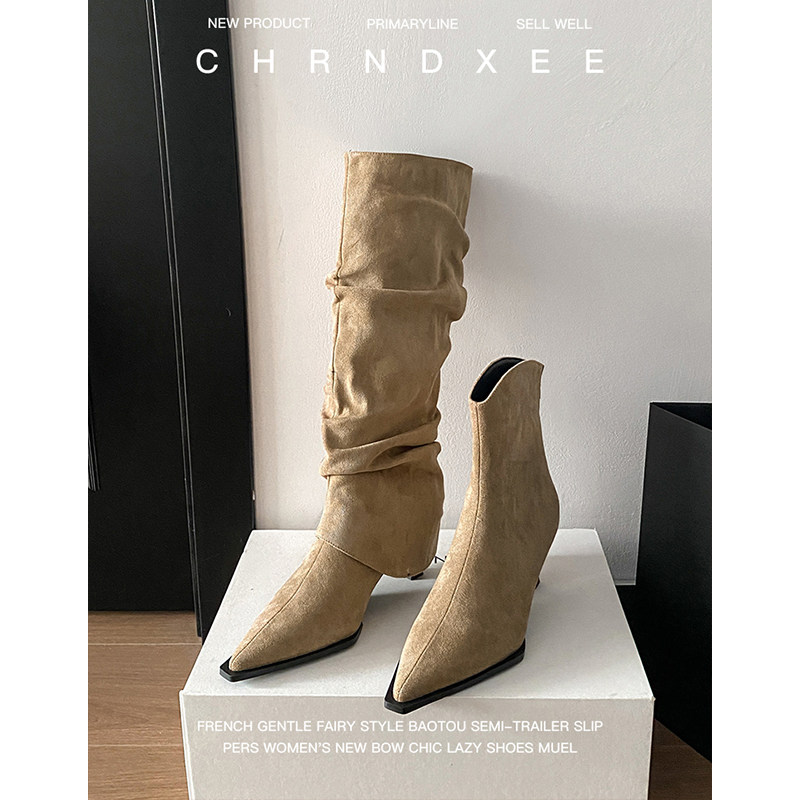 牛皮版~尖头绒面细跟裤管靴女2025新款高跟靴长靴卡其色黑色高筒