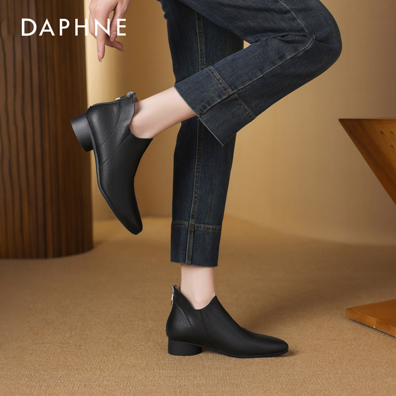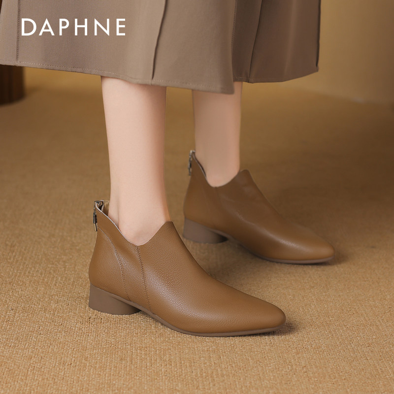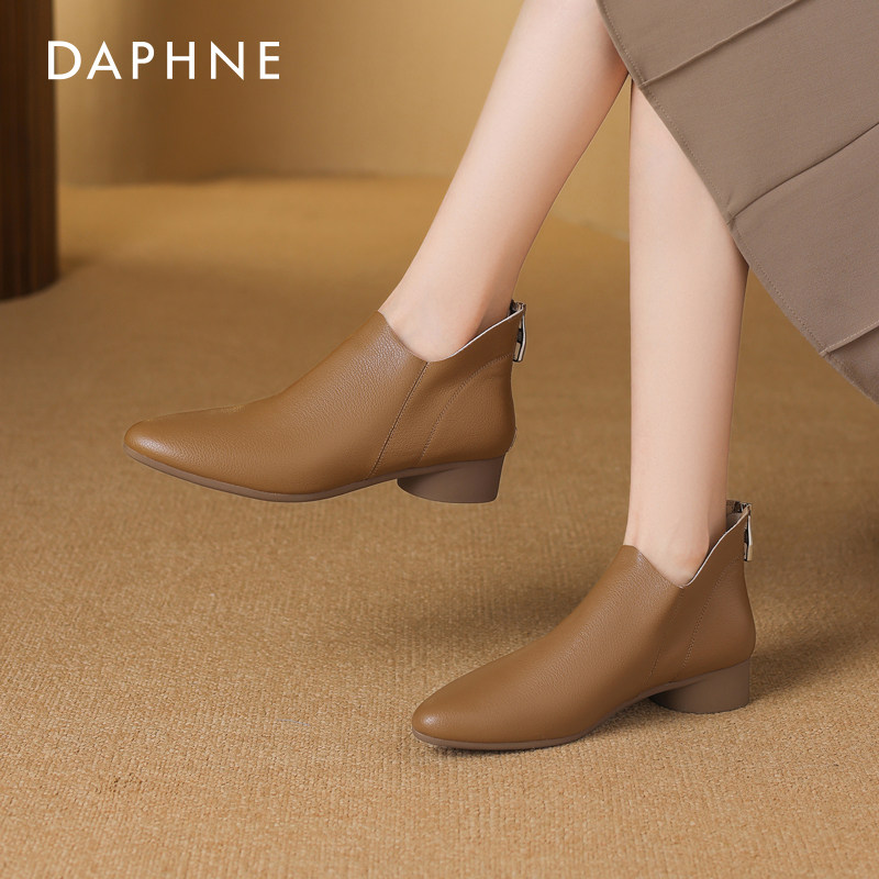 达芙妮软皮短靴女春季2026新款低跟尖头深口单鞋春款妈妈踝靴秋款